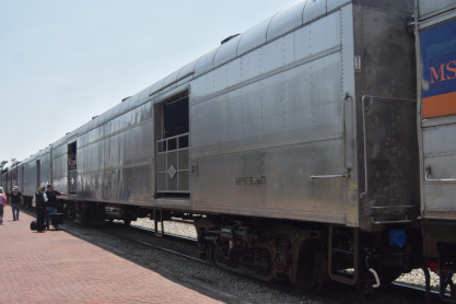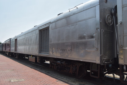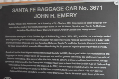 Fort Wayne Railroad Historical Society power car 3679, ex. Amtrak 1252, nee Santa Fe baggage car 3679 built by American Car and Foundry in 1955. Thanks to a grant from the David A. Donhoo Trust and Central Indiana Foundation, the car was upgraded into a head-end-power car that produces 480 volts of electricity for the passenger train, a vital necessity in daily operation. It carries two 300 kilowatt diesel-electric generators and a store room for passenger train supplies.