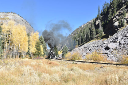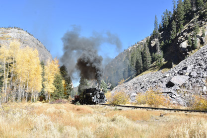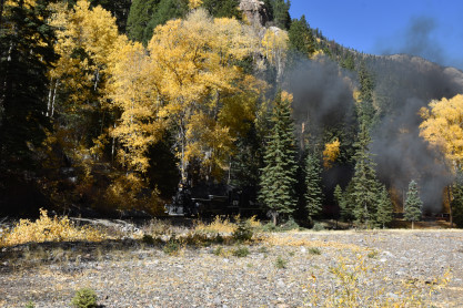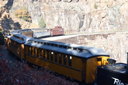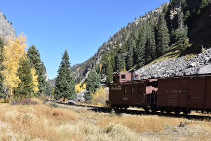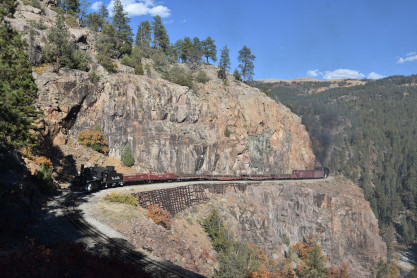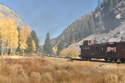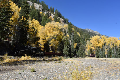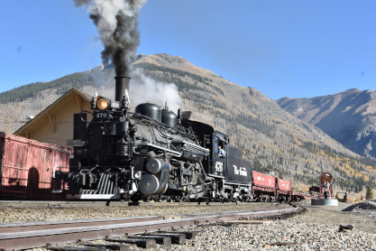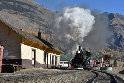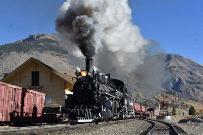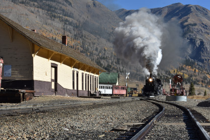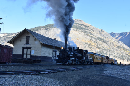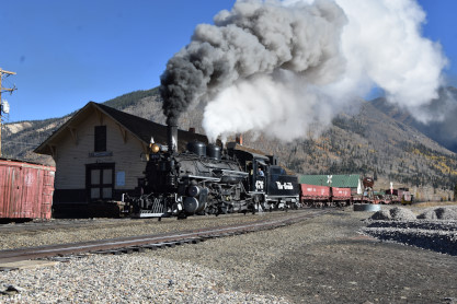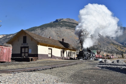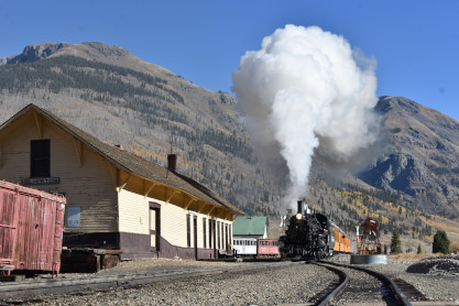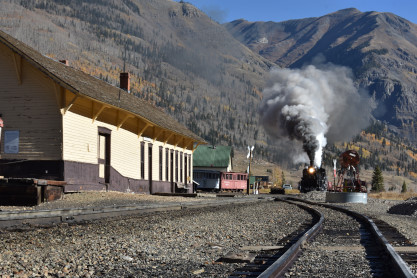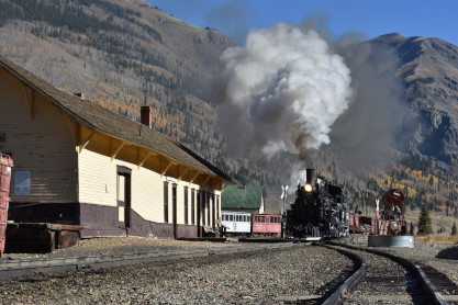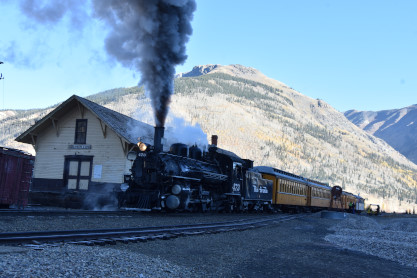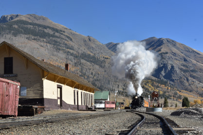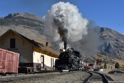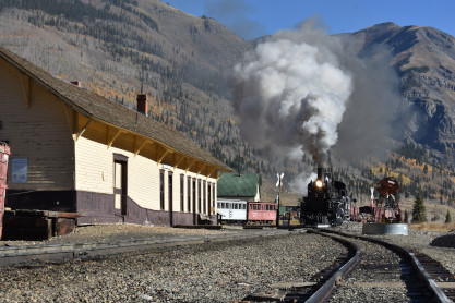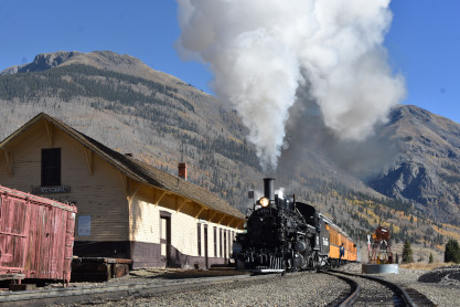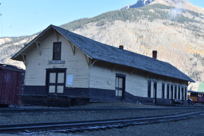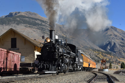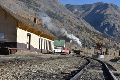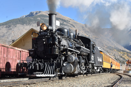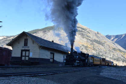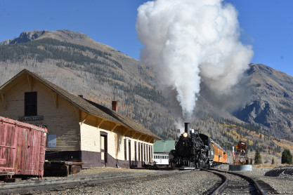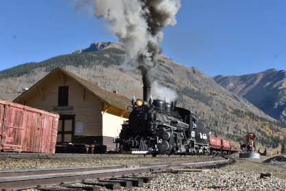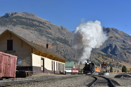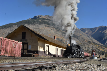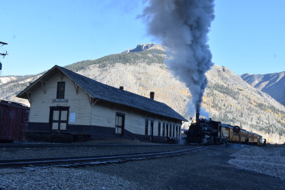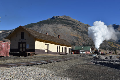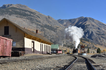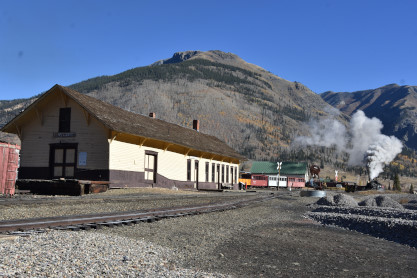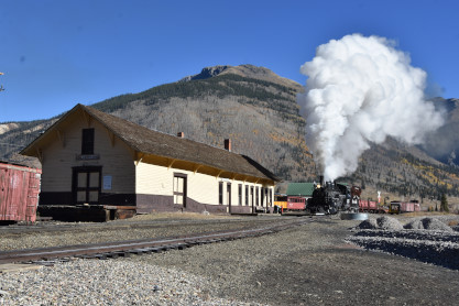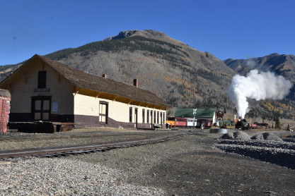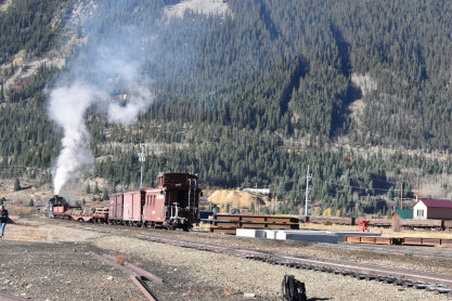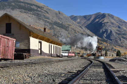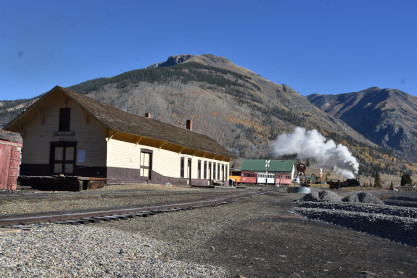 Elizabeth and I arose and following our Internet duties, walked over to the Elevated Coffee Company for breakfast as this was the end of the season and no restaurants were open for breakfast. After that, we returned to our room at the Avon Hotel before checking out and walked the two blocks north to the freight train, loaded our luggage into the box car then waited to board the train. Once all the charter participants were aboard, we left for the Silverton station for several photo runbys.