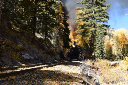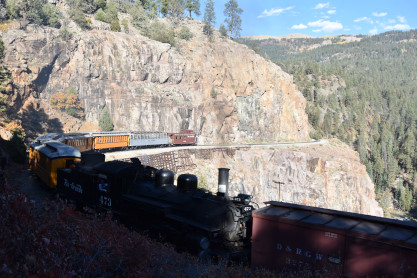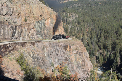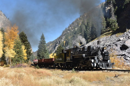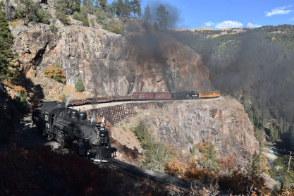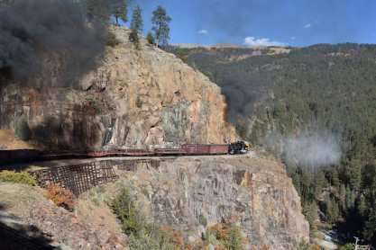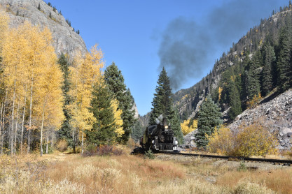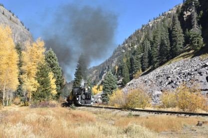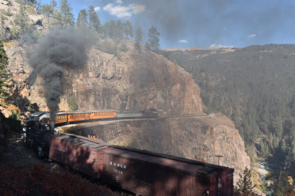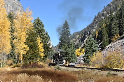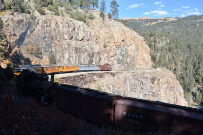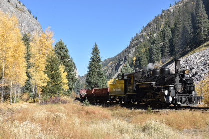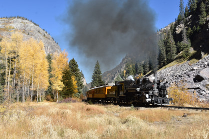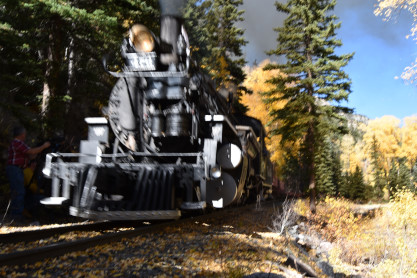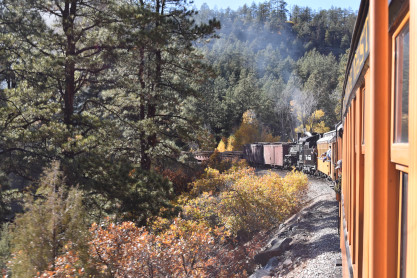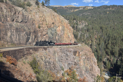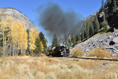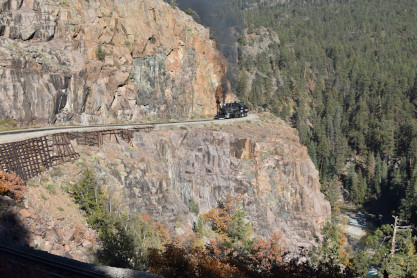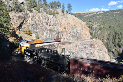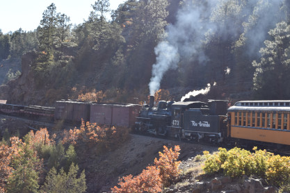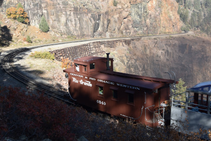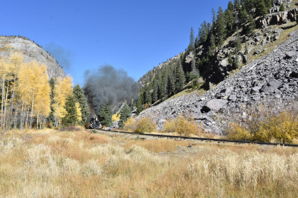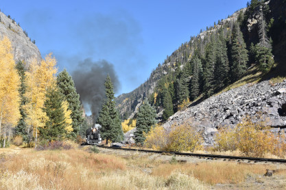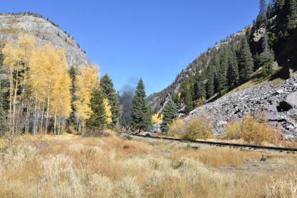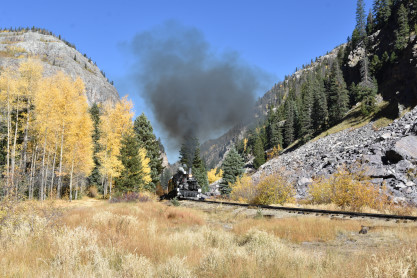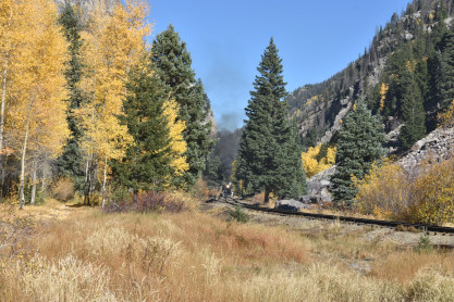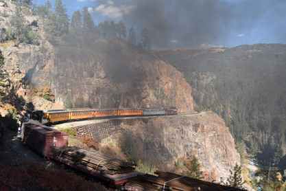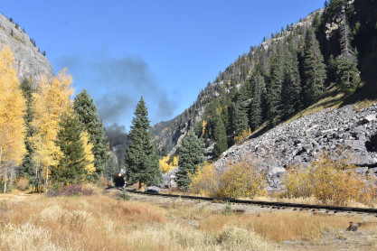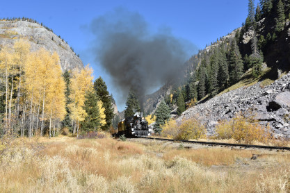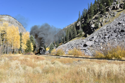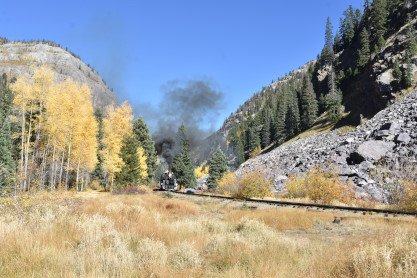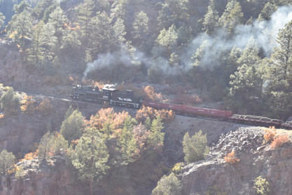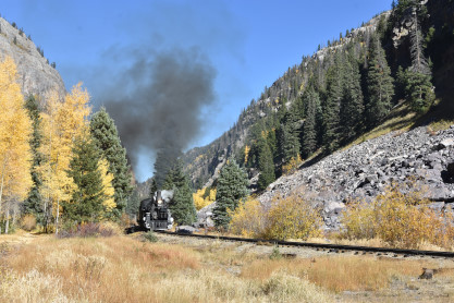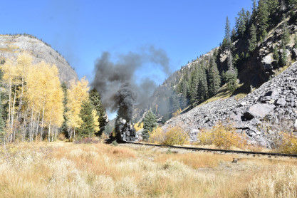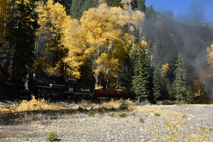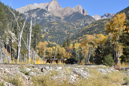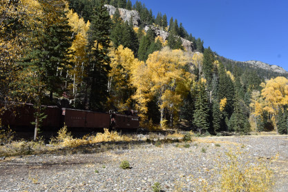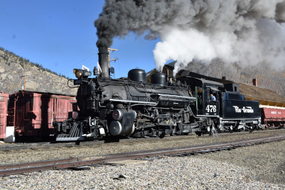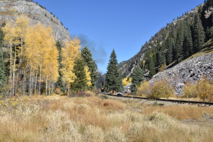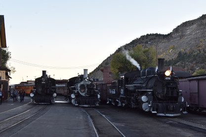 Elizabeth and I arose and following our Internet duties, walked over to the Elevated Coffee Company for breakfast as this was the end of the season and no restaurants were open for breakfast. After that, we returned to our room at the Avon Hotel before checking out and walked the two blocks north to the freight train, loaded our luggage into the box car then waited to board the train. Once all the charter participants were aboard, we left for the Silverton station for several photo runbys.