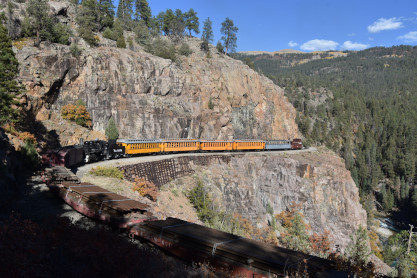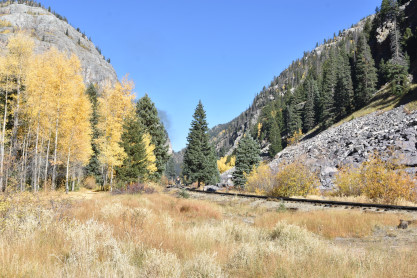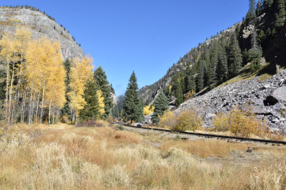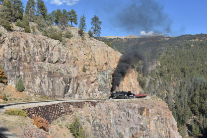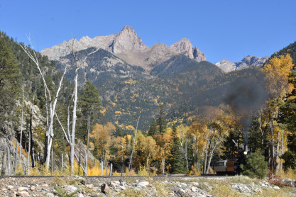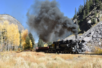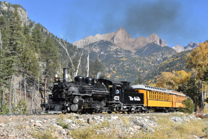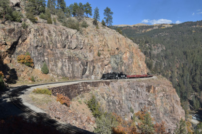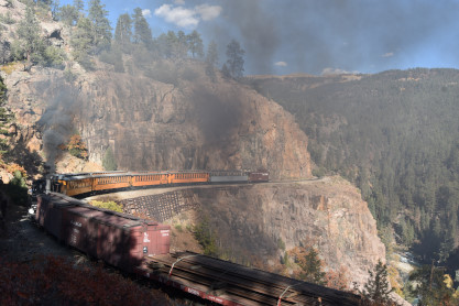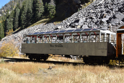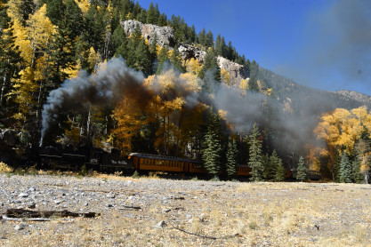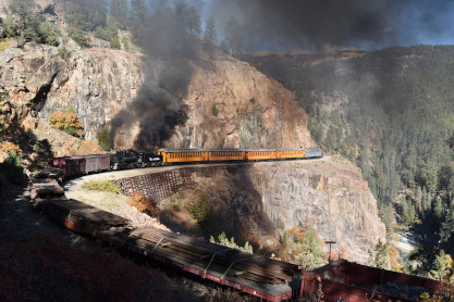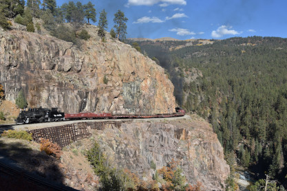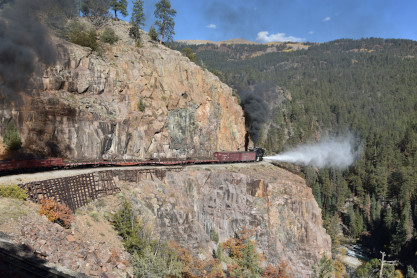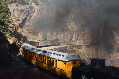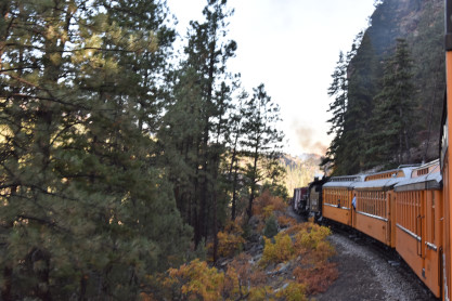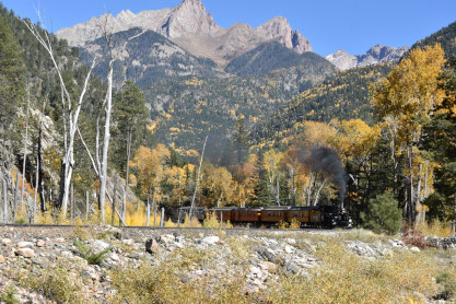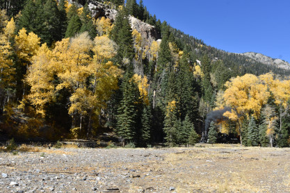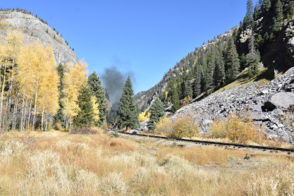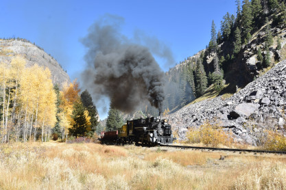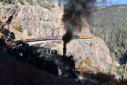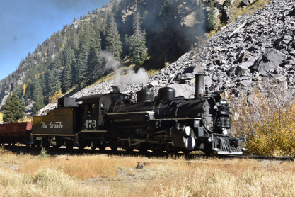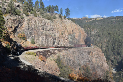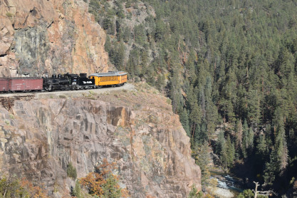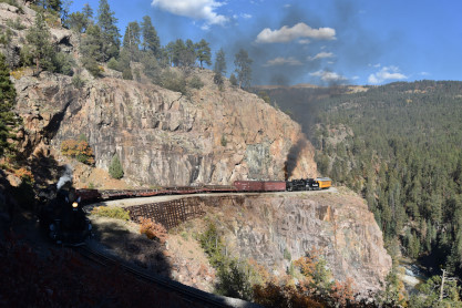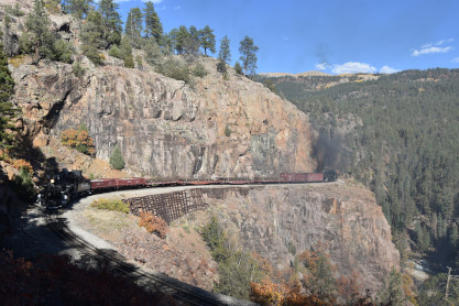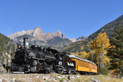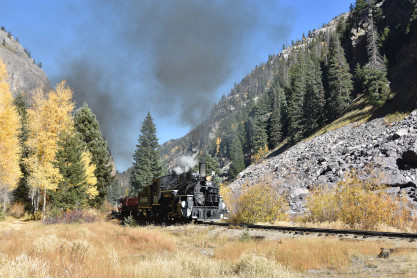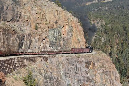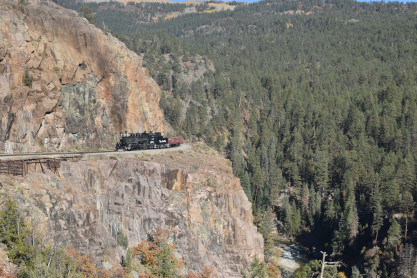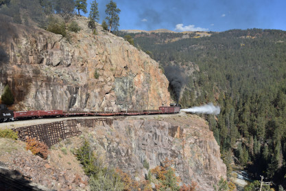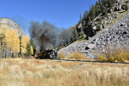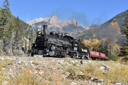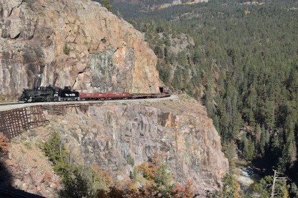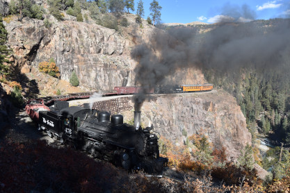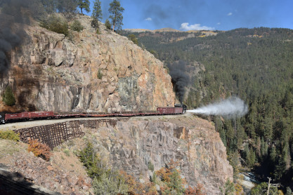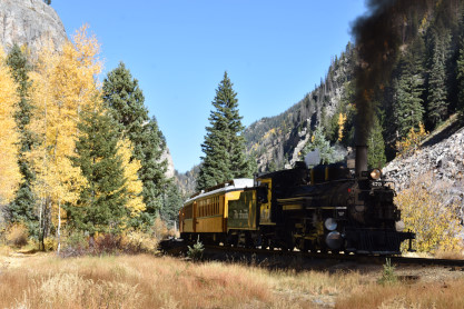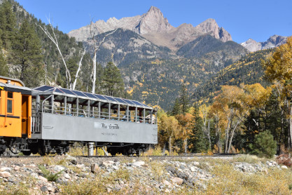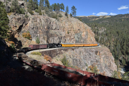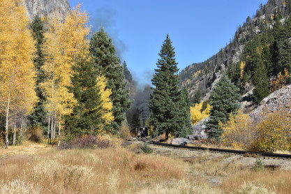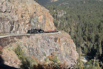 Elizabeth and I arose and following our Internet duties, walked over to the Elevated Coffee Company for breakfast as this was the end of the season and no restaurants were open for breakfast. After that, we returned to our room at the Avon Hotel before checking out and walked the two blocks north to the freight train, loaded our luggage into the box car then waited to board the train. Once all the charter participants were aboard, we left for the Silverton station for several photo runbys.