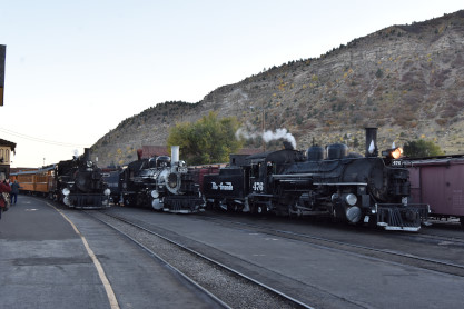 Photo runby seventeen, the last one of the day. We ran to Rockwood to detrain the passengers who had chased the train from Durango then proceeded back to Durango in front of the helper and the train going to Durango. We went around the balloon track, a first for everyone, so we all had some rare mileage, then all detrained and the three K28 engines were in front of the depot for ten minutes. We hurried to take our pictures.