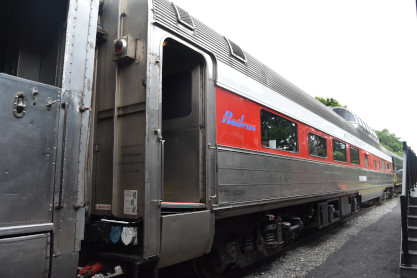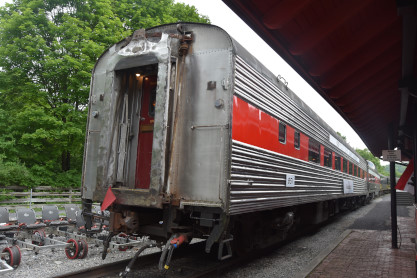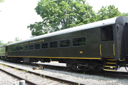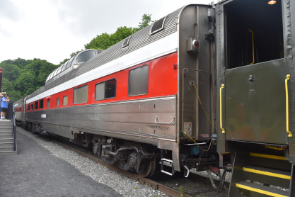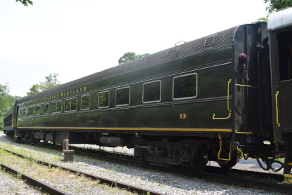 Western Maryland Scenic coach 810 ex. MARC, exx. South Eastern Michigan Transportation Authority 1403, exxx. Penn Central 1482, exxxx. Pennsylvania Railroad 1482, nee Nortfolk and Western "Mercer County", built by Budd Company in 1950, rebuilt from smooth sided ten roommette-six double bedroom.