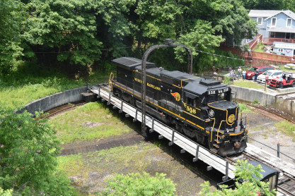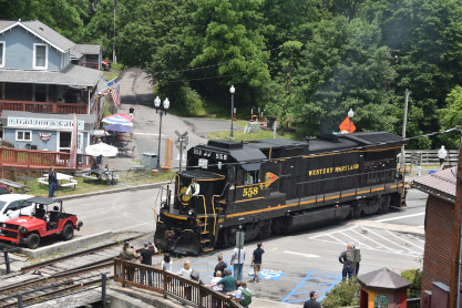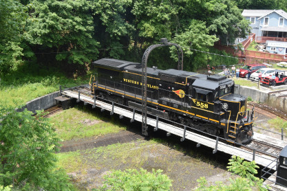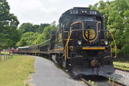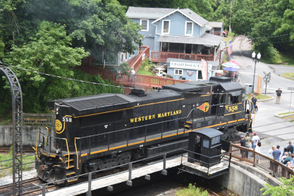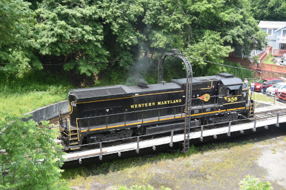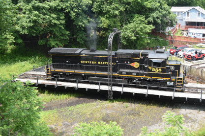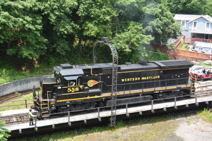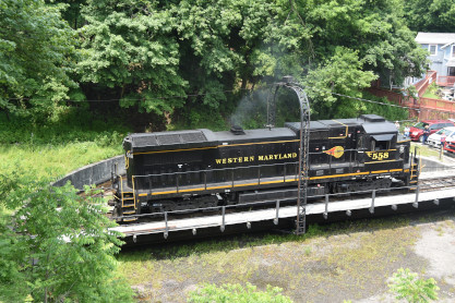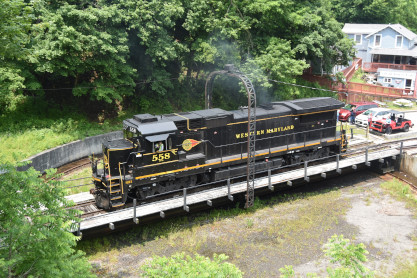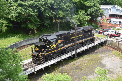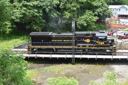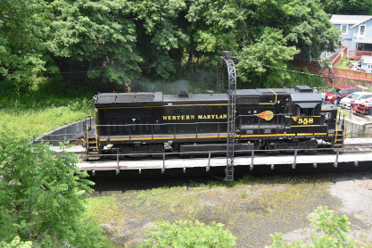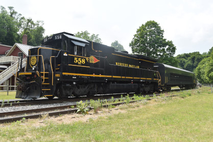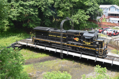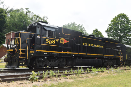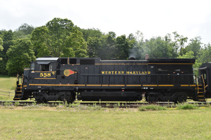 Western Maryland Scenic Railway B32-8 558, nee Norfolk Southern 3558 built by General Electric in 1989. This is the first and only General Electric locomotive in the history of the Western Maryland Scenic Railway, which arrived in August 2022. The 558 operates long hood forward and is not owned by the railway; it is currently leased from Northern Illinois & Wisconsin Railway.