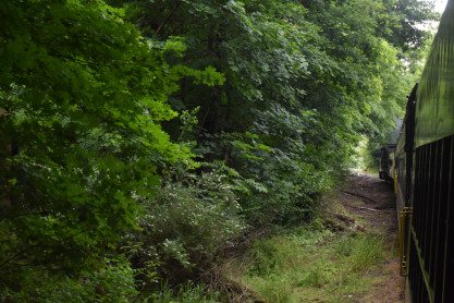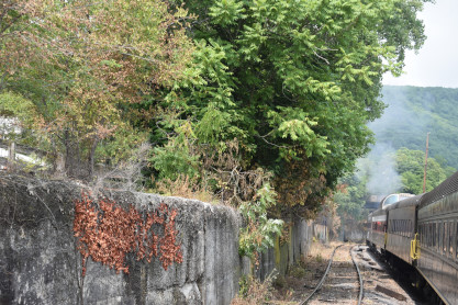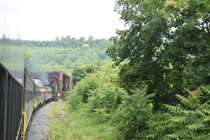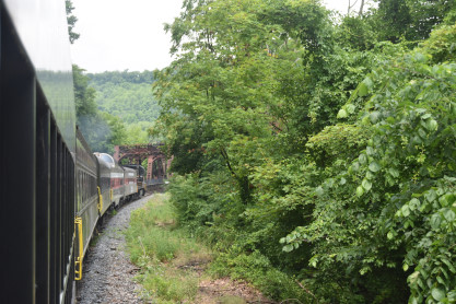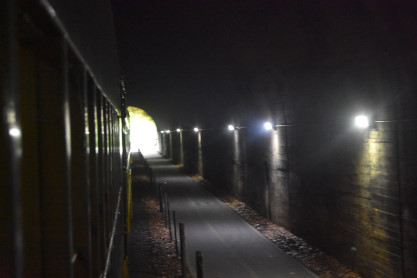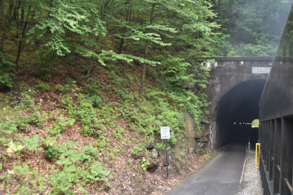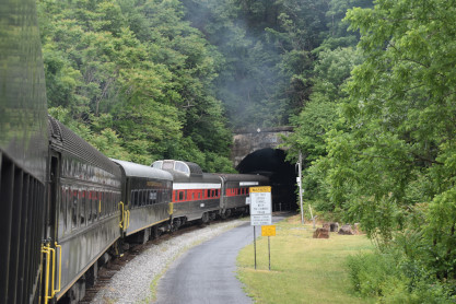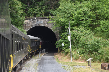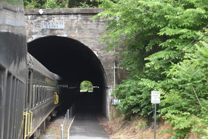 The trip through Brush Tunnel, which was constructed in 1911 by the Western Maryland Railway as part of its expansion from Cumberland to Connellsville. The walls of the double-track tunnel are constructed of cement and at either end is a rectangular cement portal with an arched opening and a corbeled edge.