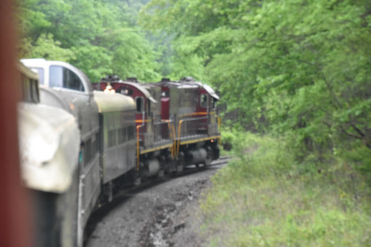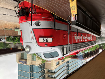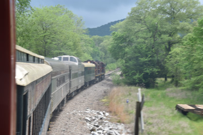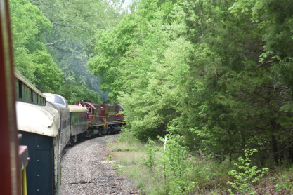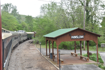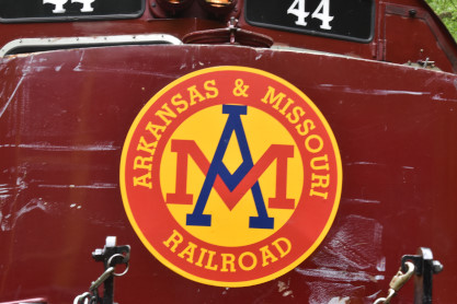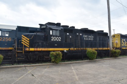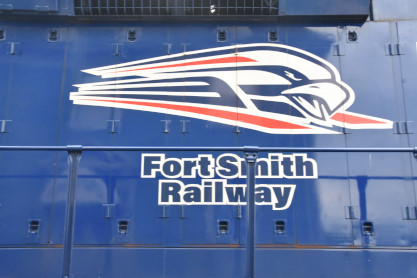 the tunnel portals were installed. The north end of the the tunnel. The Winslow train shelter. We pulled into the siding. The crossing. The motive power ran around the train. The engines then re-connected to our train. The group picture inside St. Louis-San Francisco caboose 1291, taken in Winslow. On the return trip, Elizabeth and I rode in the bottom portion of the caboose so that others could enjoy the view from the cupola. On the Mainline A&M Railroad Caboose Restoration. Arkansas and Missouri emblem. The Interstate 49 waterfall. Frisco emblem in the caboose. We returned to Van Buren and our excellent, smooth and enjoyable trip in the caboose was over. We said our goodbyes and drove to Fort Smith. Pioneer Railroad GP38-2 3832, ex. Norfolk Southern 5071, nee Southern 5071, built by Electro-Motive Division in 1973. Fort Smith Railway emblem. Fort Smith Railroad GP16 2002, nee Santa Fe 3002, built by Electro Motive Division in 1960. Fort Smith Railroad slug 2256, ex. Larry's Truck and Electric 2256, exx. CSX 2256, nee Gulf Mobile and Ohio 508, built by Electro Motive Division in 1963. Overview of the engine facility. Hot Springs Street Railway double-ended double-truck open platform streetcar 50 built by St. Louis Car Company in 1904. We boarded for a ride but this particular car cannot negotiate the tight turns of the museum's trackage and