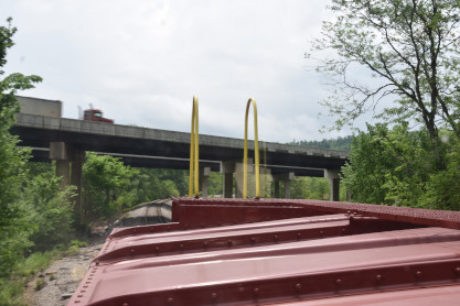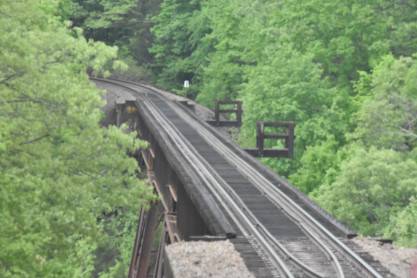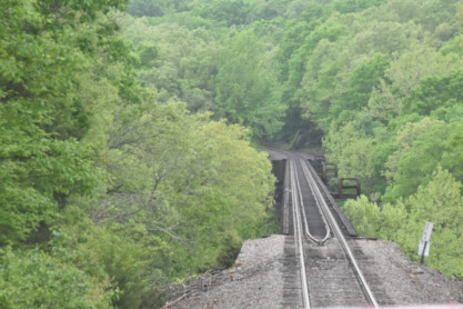 December 2004. St. Louis-San Fransisco caboose 1291. Elizabeth and the author in the cupola of the caboose which we rode to Winslow. We left Van Buren. Leaving Van Buren behind. Van Buren High School Blakemore Stadium. Van Buren High School Football Stadium. We ran by Smeltzer siding, capable of holding ten cars. Going underneath Lost Beach Road. My loving wife Elizabeth riding in the cupola across from me. Curving to the right. Looking out of the south end of the train. The author in the cupola. The view forward. Frog Bayou was crossed on a 204 foot trestle. Curving to the right where a welded rail was replaced. A look back beyond the train. At Stewart, we stopped for two passengers. Finally we saw the locomotives. A delicious and plentiful lunch was distributed to all passengers. Crussing Frog Bayou on a 520 foot trestle. Another crossing of Frog Bayou, this time on a 482 foot trestle. Frog Bayou on a 521 foot trestle, with a trespasser in the picture. The next crossing of Frog Bayou on a 493 foot trestle. The train continued to curve to the right. The next crossing of Frog Bayou was on a 493 foot trestle. We approached Interstate 49. View from the caboose looking forward. Hurricane Bridge, an 355 long trestle. Frog Bayou, a 290 foot trestle. A look back down the tracks behind us. The train ran through Mountainsburg. Clear Creek. Frog Bayou Bridge, a 537 foot testle. Another right-hand curve. The Howard Fork of Frog Bayou, crossed on a 633 foot trestle. We next ran through Chester. A look back at Howard Fork of Frog Bayou Trestle. We went under Interstate 49. Howard Fork of Frog Bayou Trestle, 653 foot trestle. The trains curves to the right. Going underneath Interstate 49. Interstate 49 waterfall. Yet another curve. Passing through Armanda. Looking back from the cupola. We entered a cut. This portion of the route allowed for excellent views of the locomotives. Trestle 3, 110 feet high and 451 feet long, was built using seven deck girders and is known as Boston Mountains Viaduct 3. Trestle 2, known as Boston Mountains Viaduct 2, is 421 feet long and 110 feet high. The train curved to the right. Trestle 1 stands 125 feet high and 780 feet long and is known as Boston Mountains Viaduct 1. Looking back to Trestle 1. The train curved to the right. We entered the Winslow Tunnel built by the railroad in 1968. In 1981, Morrison Knudson enlarged, commencing construction on September 26, 1981 and completing it on July 27, 1982. It had a length between 1,693 and 1,703 feet before