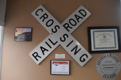 Railroad crossbucks, Heritage Rail Alliance membership certificate, Arkansas-Boston Mountains Chapter, NRHS, certificate and Arkansas and Missouri Silver Anniversary 1986 to 2011.