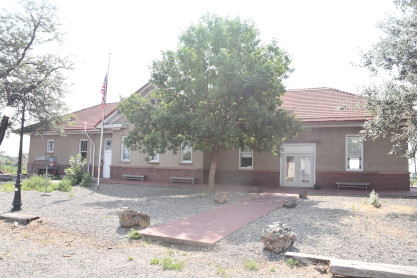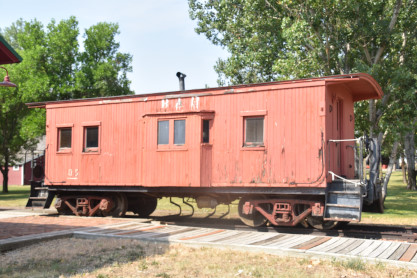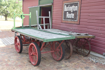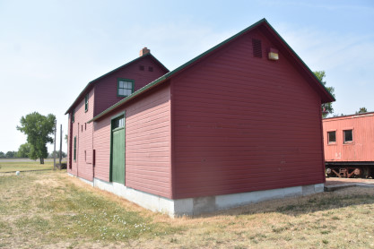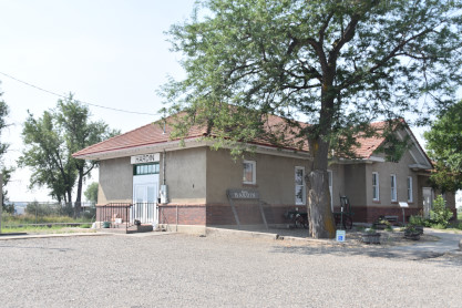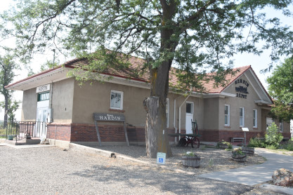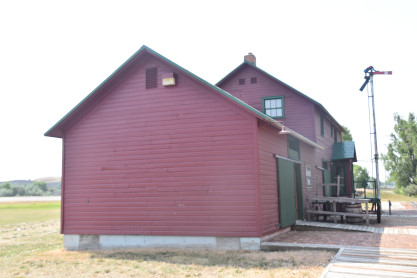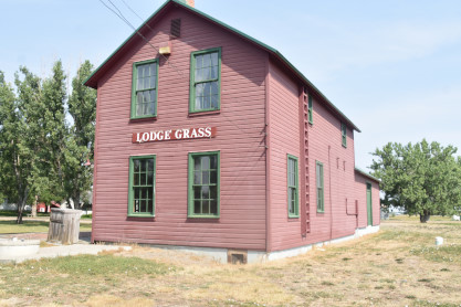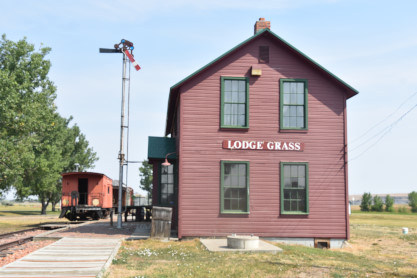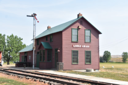 Chicago, Burlington and Quincy Lodge Grass station constructed in 1906 and relocated to Hardin in 1987, where it was placed in the Big Horn County Historical Museum. It quickly became the center of the growing small town since almost everything, including the mail, arrived by rail. The first floor consists of a waiting room, warm and cold freight rooms and the agent's office which is complete with early day equipment. Displays include original railroad equipment, carts and photographs. Upstairs served as a home to the depot agent. Rooms include a living-room, a kitchen and two bedrooms.