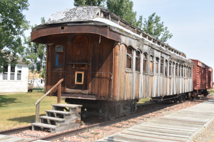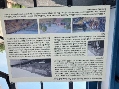 When the fair ended and the train returned to Montana, the cars were distributed to Montana communities large and small. Some were adopted by towns and used as offices for Chambers of Commerce. Some were abandoned in wheat fields, their large painted panels now faded by the sun.