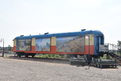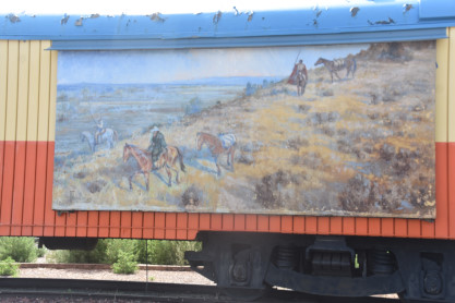 The Territorial Train of Montana celebrating seventy-five years of being a territory. It was originally a four-axle Norfolk and Western baggage car, donated by the railroad to the West Virginia Centennial Special then sold to Montana Centennial Train. On the road, this car was the entrance, with visitors entering through the end door; however, at the World's Fair in 1965, it was not. Murals on both sides of the car were identical. When the car returned to Montana in 1965, it gained the number Chicago Burlington and Quincy 501. Today the car sits at the Hardin depot with three new and different murals by new artists.