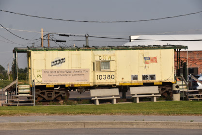 Chicago North Western bay window caboose 10380 built by International Car in 1954.
