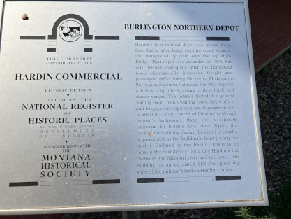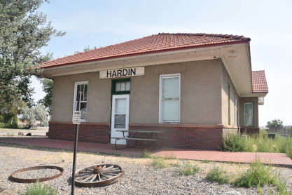 Chicago, Burlington and Quincy Hardin station built in 1922. Hardin's first railroad depot was moved from Fort Custer after being cut into small sections and transported by train over the Big Horn Bridge. That depot was expanded in 1909 but was deemed inadequate after the homestead boom dramatically increased freight and passenger traffic during the teens. Modelled on Burlington depots in Nebraska, it is a hollow clay tile structure with a brick and stucco veneer. The interior included a general waiting room, men's waiting room, ticket office, and baggage and express room. Segregation was in effect in Hardin, and in addition to men's and women's bathrooms, there was a separate bathroom for Indians. Like other depots, the back of the building is equally as prominent as the building's front. Declared by the Hardin Tribune to be "one of the best depots" for a city Hardin's size "between the Missouri river and the coast", the building, at an estimated $100,000 price tag, showed the railroad's faith in Hardin's future.