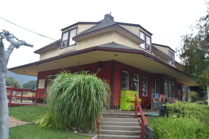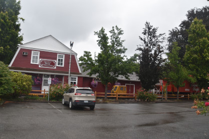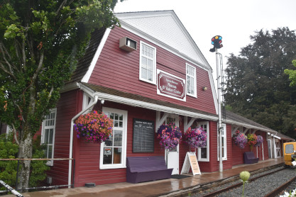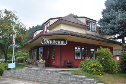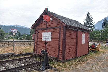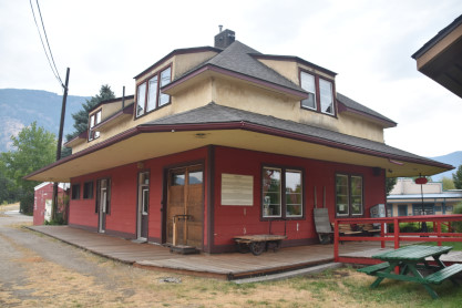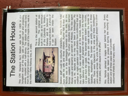 The station was moved here from its original location on the far side of the maple tree, next to the Kettle Valley Railway line, in 1985.