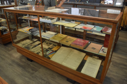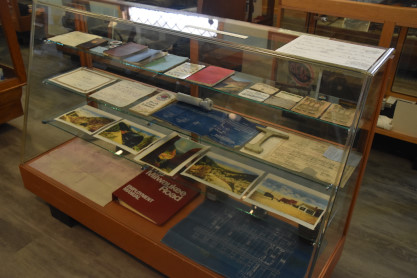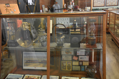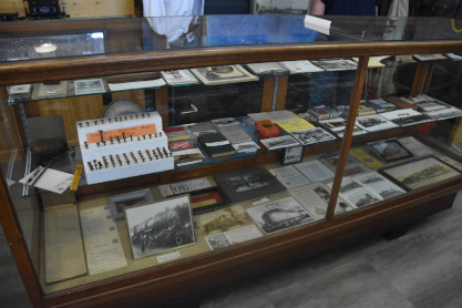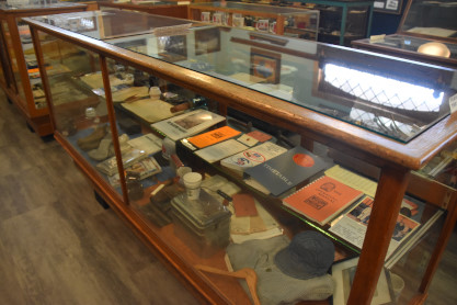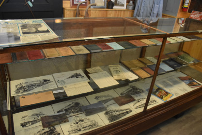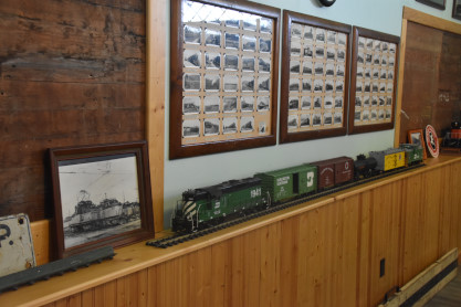Display cases full of Milwaukee Road and Northern Pacific memorabilia and ephemera.