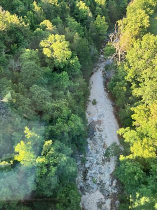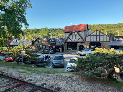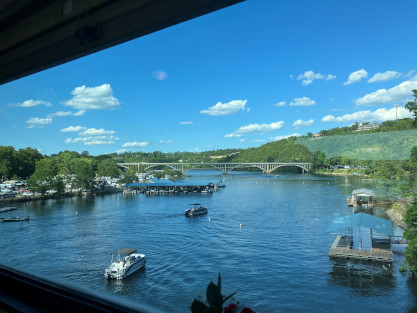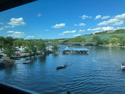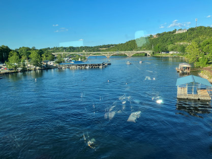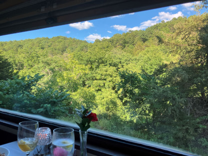 drops and for all practical purposes, becomes a very deep, cold and fast-running river. Exactly how deep, cold and fast depends on how many generators are being used to generate electricity at Table Rock Dam. The stairway to the dome. The view from our table. We went through the Crest Tunnel, a 3,485 foot bore completed in 1903 and enjoyed our meal for Prime Rib for me and Baked Fish for Elizabeth, both of which were excellent. Crossing the Walnut Creek trestle. While we ate, the train went through Cricket Tunnel, a 2,746 foot bore completed on October 22, 1904 then on to Barren Fork trestle, which is 913 feet long and 125 feet high. Views from Barren Fork trestle, our turn-around point. Dessert was chocolate cake, which was most delicious. Trees on the way back. We had a nice conversation with the couple at our table during our meal. A rose was on everyone's table and the crew gave each lady a choice of a red or yellow rose to take home; Elizabeth chose a yellow rose. About to cross the Walnut Creek trestle. The view crossing the trestle. The very happy couple. This gentleman entertained each car and for ours, played and sang "That's Amore" and played "Habanera" from "Carmen" on his accordion. The White River that we followed back to Branson. Passing underneath the road that goes to Branson Airport. A few of the many shops in Hollister as we passed through. Crossing Lake Taneycomo again for the last time today. Coming back into the station area, we passed Main Street Lake Cruises. Upon arriving at the station, we detrained, ending a happy anniversay day of celebration. Branson Scenic Railroad dome-observation 9320 "Silver Terrace", ex. Rail Voyages in 1993, ex. Amtrak 9320, ex. Burlington Northern 1192 (not applied), nee Chicago, Burlington and Quincy 365 built by Budd Company in 1952, which ran