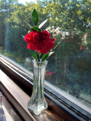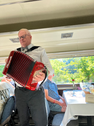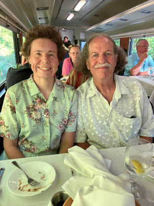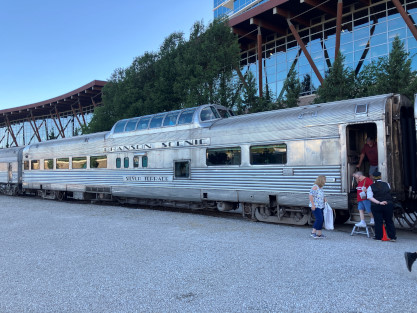 Our VisitWe walked into the depot and picked up our tickets with a car number on the recipt then waited for our car to be called. We would be in BSRX 9320 "Silver Terrace", a 1952 Budd dome-observation from the Chicago, Burlington and Quincy train Kansas City Zephyr. After several cars were called before ours, we boarded and I led the way to our table which had our surname and menu choices on a tastefully-made small sign. We were seated with the grandparents of the couple and their grandchild across the aisle. All tables had salads and rolls in a basket when we arrived. The train left a few minutes late and soon was on its way south out of the station.