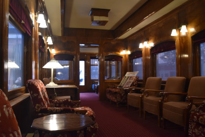 Canadian PaciFic buffet solarium lounge "River Rouge", ex. Canadian Pacific work car 411294 1980, exx. Canadian Pacific café-observation parlour 6591 1960, nee Canadian Pacific "River Rouge", built by National Steel Car and the railway in 1929. This car was built for the 1929 Trans Canada Limited, a Montreal-to-Vancouver train.