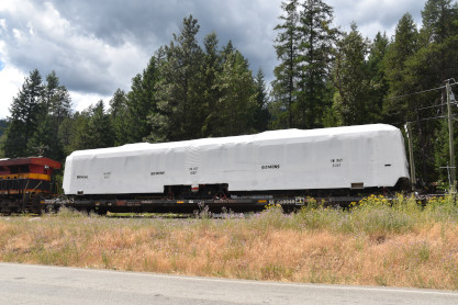 A wrapped Calgary Transit Series 6 light rail vehicle (LRV) on its way to Sacramento for refurbishment. Information courtesy Martin Isles.