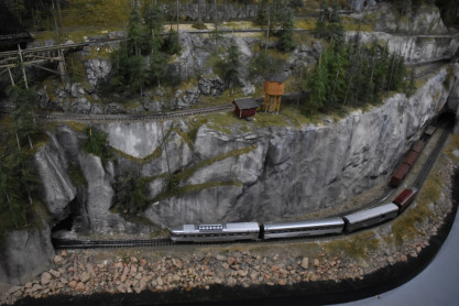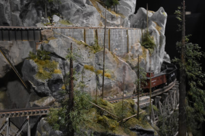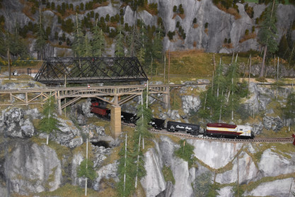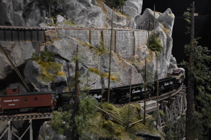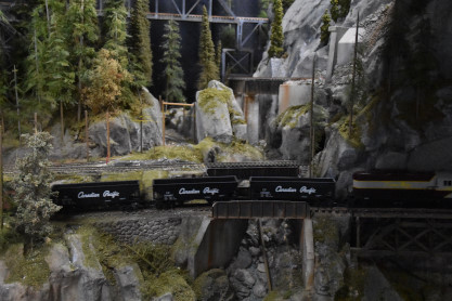 The tiny trains depicted here include Canadian Pacific Railway and Canadian National Railway cars and engines as they traverse a landscape resembling BC's Kettle Valley. They trundle, chug, and hoot past sparkling lakes, along high mountain ledges, through dark tunnel’s, and over tall trestle bridges. You can hear the sound of the trains as they weave their way over five lines and four levels through a forests of 6000 cedar, hemlock and fir trees. Each branch of every tree has been individually glued into place, mounted on wooden struts overlaid by Styrofoam, and bound together by fast drying orthopedic bandages. This “O” gauge model railway is over 80 feet long consisting of floor to ceiling model diorama landscapes.