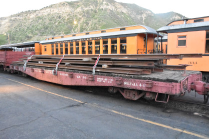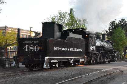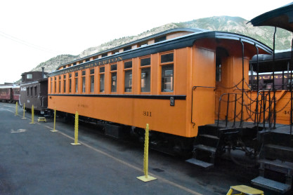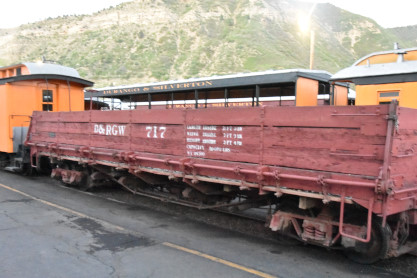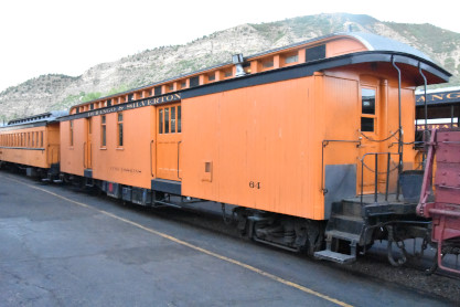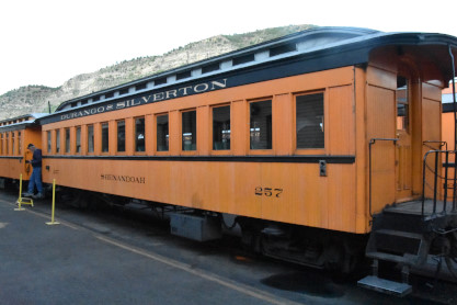 Durango and Silverton 2-8-2 K36 480, sold to Durango & Silverton and moved to Durango in 1981, built by Baldwin in 1925 and restored to operation in July 1985. It was converted to burn oil in early June 2020. The engine then reversed onto our train set. Durango and Silverton hopper car 9325, builder and year unknown. Durango and Silverton hopper car 9328, builder and year unknown. Durango and Silverton flat car 6519, built by American Car and Foundry and the railroad in 1940. Durango and Silverton flat car 6508, built by American Car and Foundry and the railroad in 1940. Denver Rio Grande and Western drop-bottom gondola 717, built by American Car and Foundry in 1904. Durango and Silverton concession car 64, originally a post office car built by the railroad in 1887. Durango and Silverton coach 257 "Shenandoah", ex. Rio Grande Southern 257, nee Denver and Rio Grande 267 built in 1880. Durango and Silverton coach 311 "McPhee", nee Denver Rio Grande and Western 87 built by Jackson and Sharp in 1881. Durango and Silverton caboose 0540 built by the railroad in 1923. The above was the complete trainset for our excursion. When we were allowed to board, Elizabeth and I chose seats in Durango and Silverton coach 311 "McPhee" then had an on-time departure a 6:00 AM and five blocks from the station,