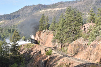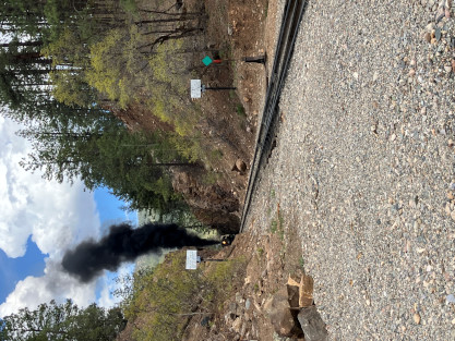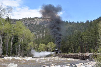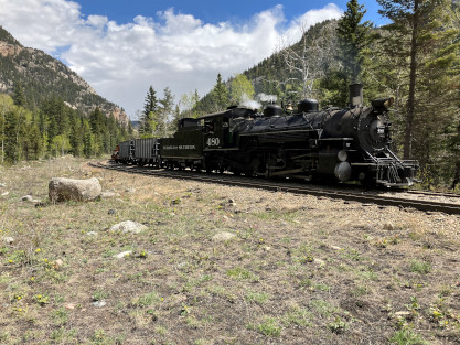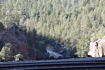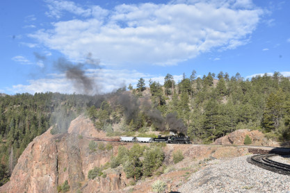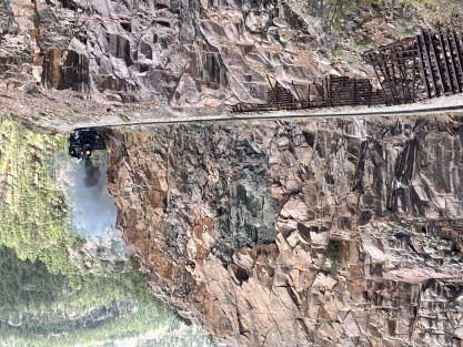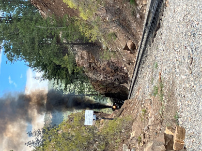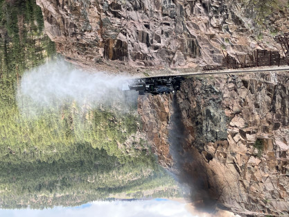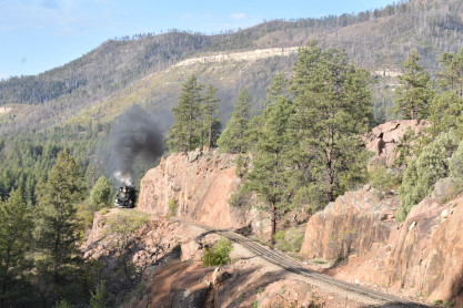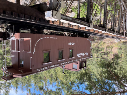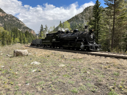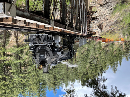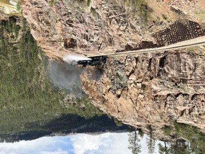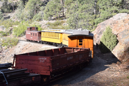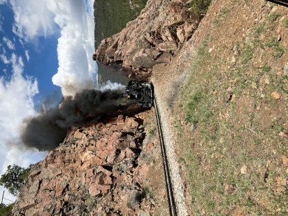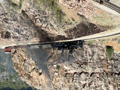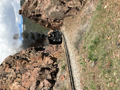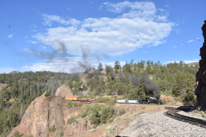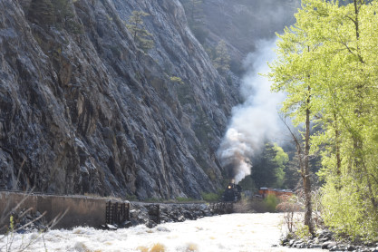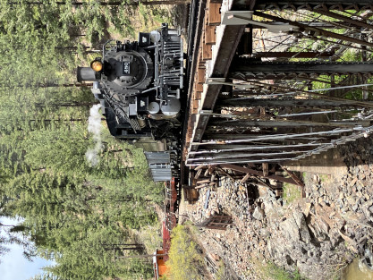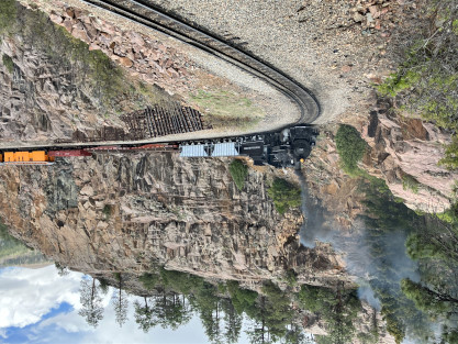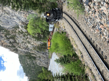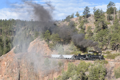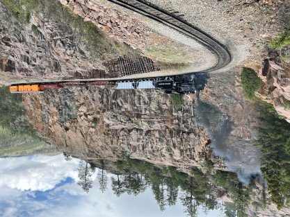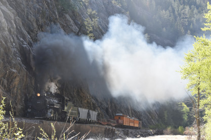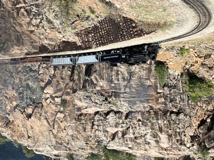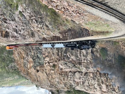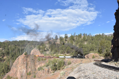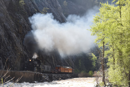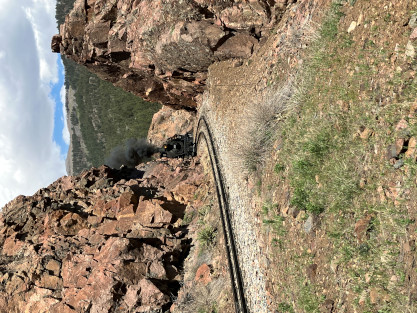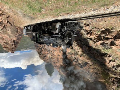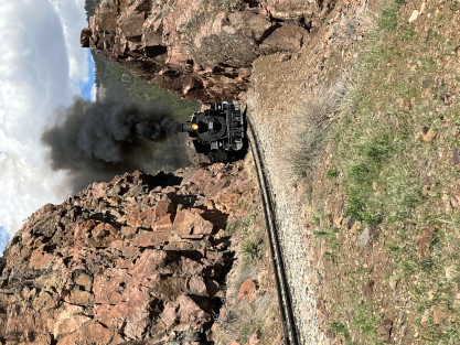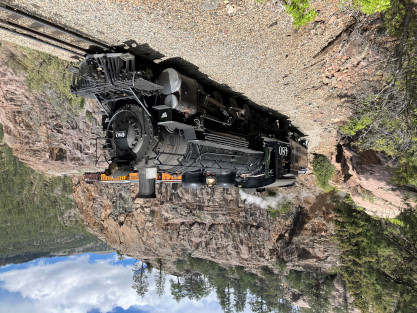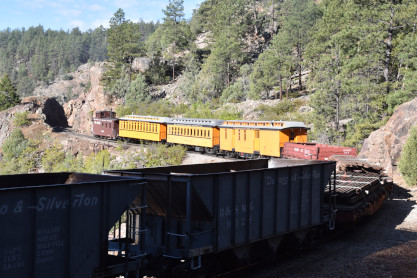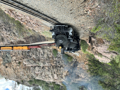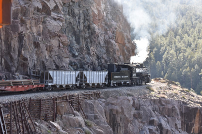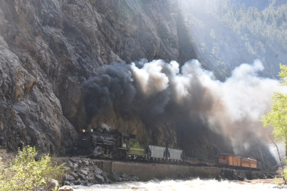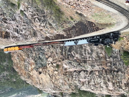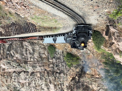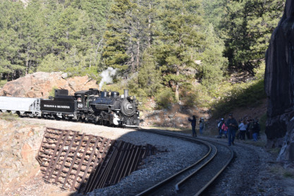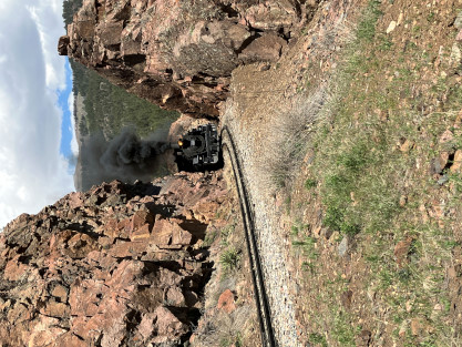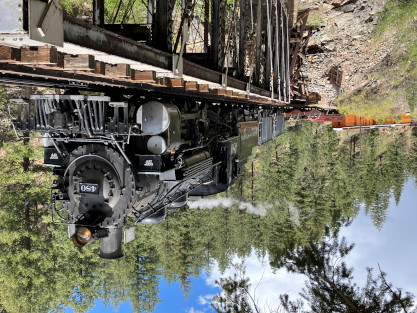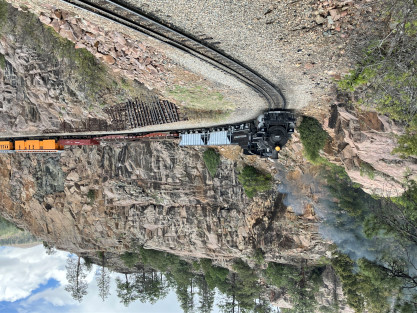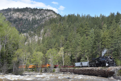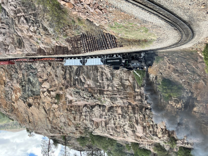 Photo runby one at Granite Rock, MP 468.75 Reverse move two. Photo runby two. We reloaded and I rode to Rockwood in the cupola of the caboose. The view from the cupola. The vista the back door of the caboose. Here at Rockwood, eight of the train chasers boarded the train and took seats in the forward coach then we went through the Rockwood Cut and out to the high line. The Rockwood station for passengers who board their train here. Entering the Rio Grande Forest signpost. The train on the high line before stopped and detrained, with half of us going with Dak and the remaining members with Bryan at his photo location. Reverse move three. Photo runby three on the High Line, MP 476.70. Reverse move four. The Las Animas River far below. Photo runby four, after which we continued. Taking on water at Tank Creek. Reverse move five. Photo runby five at the Cement Wall. We continued north to the repeating curves at Milepost 476.70. Reverse move six. Photo runby six. From here we went to the Cribbed Wall at MP 478.0. Reverse move seven. Photo runby seven at the tree tunnel, MP 483.0. We then crossed the river. Reverse move eight. Photo runby eight at river side train. We reversed to the wye at Cascade Canyon and we all gained the mileage on that wye before going to Needleton siding to meet the regular northbound train. Reverse move nine. The train ran on the mainline before it reversed and came into the Needleton siding, MP 484.0. Photo runby ten with the regular Silverton train. Our engine kept wheel-slipping as that piece of track had not been used in years and it took over half-an-hour to clear the siding. Dak then had to make a decision. If we passed