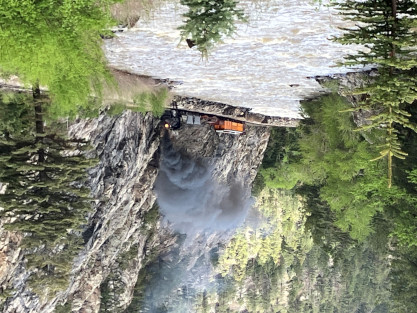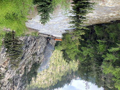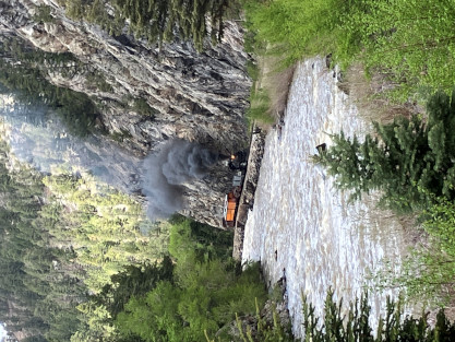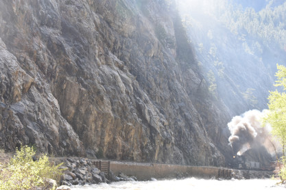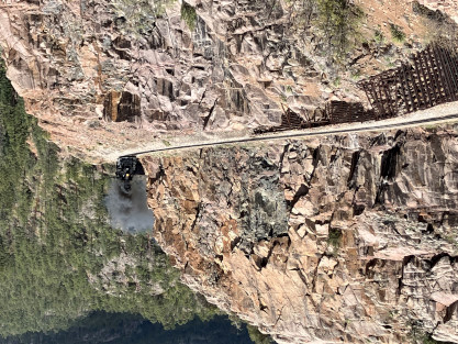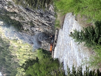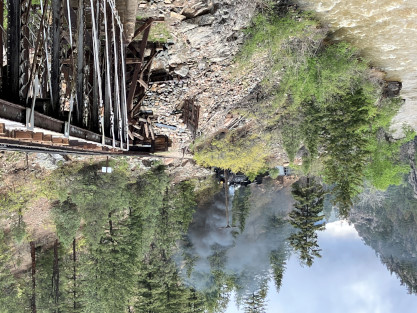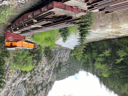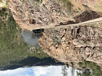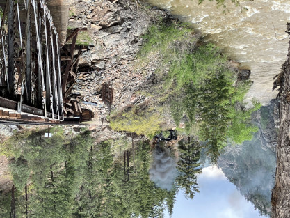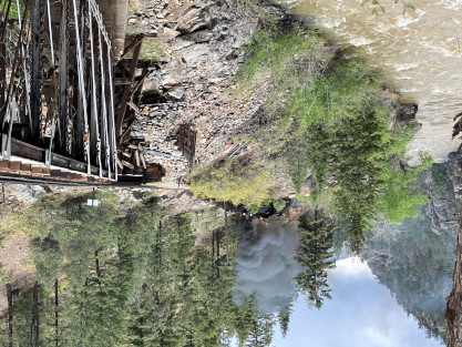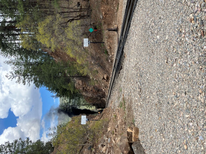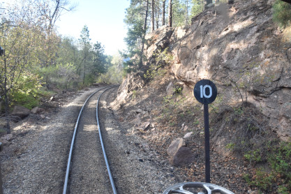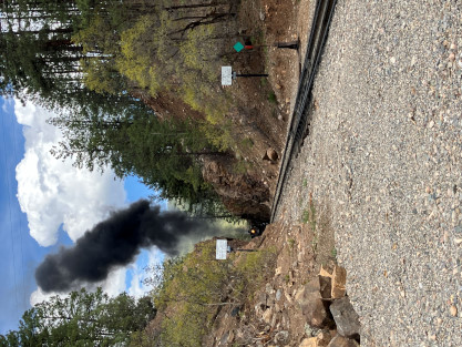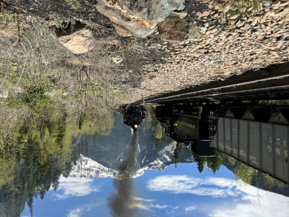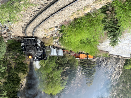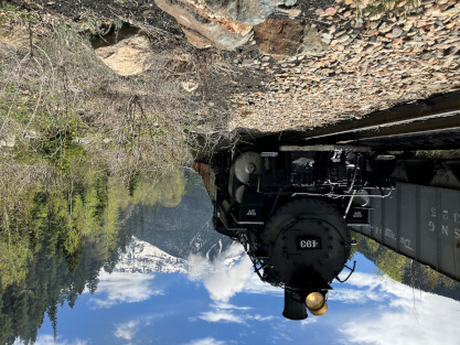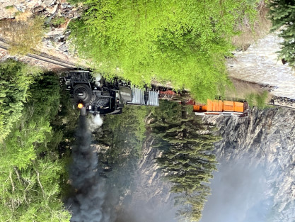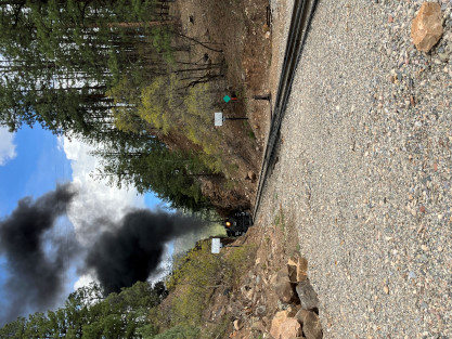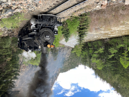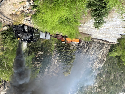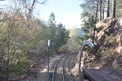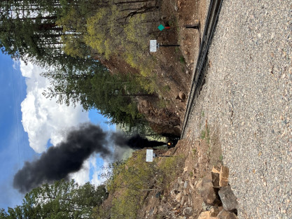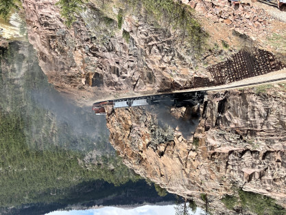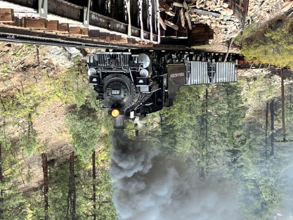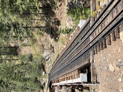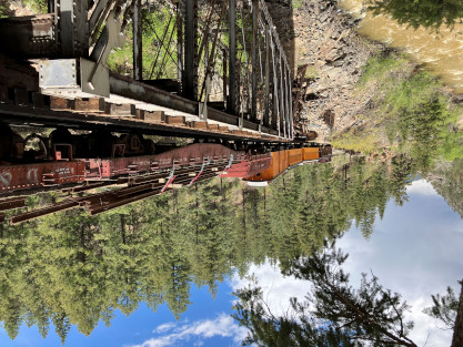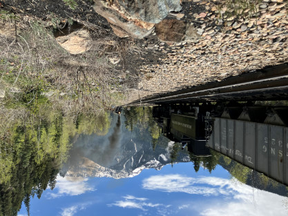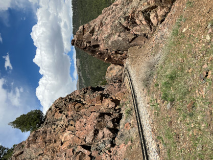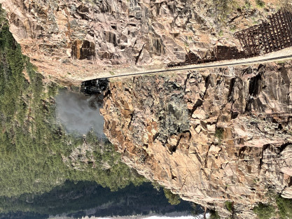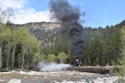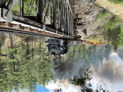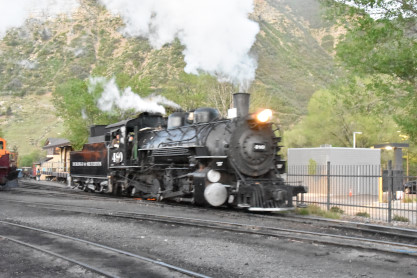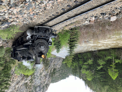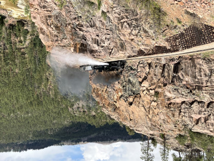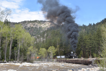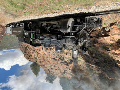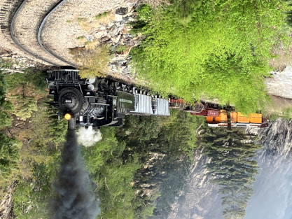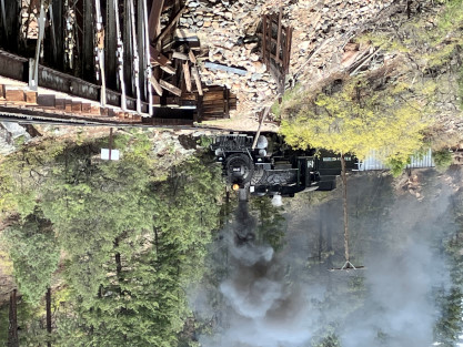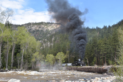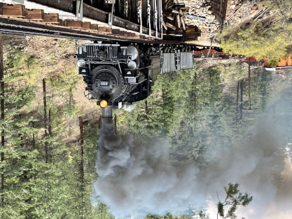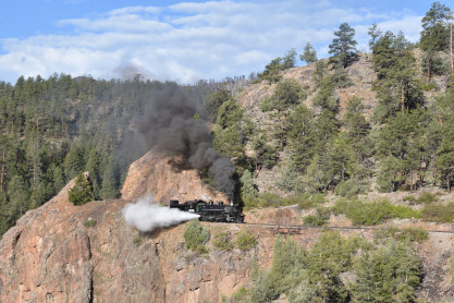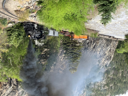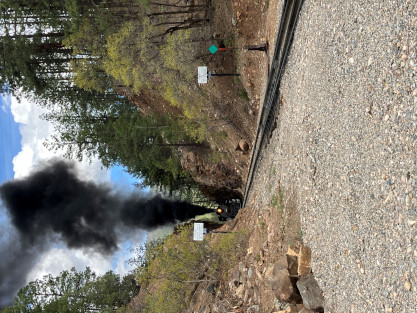 Photo runby one at Granite Rock, MP 468.75 Reverse move two. Photo runby two. We reloaded and I rode to Rockwood in the cupola of the caboose. The view from the cupola. The vista the back door of the caboose. Here at Rockwood, eight of the train chasers boarded the train and took seats in the forward coach then we went through the Rockwood Cut and out to the high line. The Rockwood station for passengers who board their train here. Entering the Rio Grande Forest signpost. The train on the high line before stopped and detrained, with half of us going with Dak and the remaining members with Bryan at his photo location. Reverse move three. Photo runby three on the High Line, MP 476.70. Reverse move four. The Las Animas River far below. Photo runby four, after which we continued. Taking on water at Tank Creek. Reverse move five. Photo runby five at the Cement Wall. We continued north to the repeating curves at Milepost 476.70. Reverse move six. Photo runby six. From here we went to the Cribbed Wall at MP 478.0. Reverse move seven. Photo runby seven at the tree tunnel, MP 483.0. We then crossed the river. Reverse move eight. Photo runby eight at river side train. We reversed to the wye at Cascade Canyon and we all gained the mileage on that wye before going to Needleton siding to meet the regular northbound train. Reverse move nine. The train ran on the mainline before it reversed and came into the Needleton siding, MP 484.0. Photo runby ten with the regular Silverton train. Our engine kept wheel-slipping as that piece of track had not been used in years and it took over half-an-hour to clear the siding. Dak then had to make a decision. If we passed