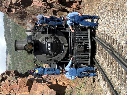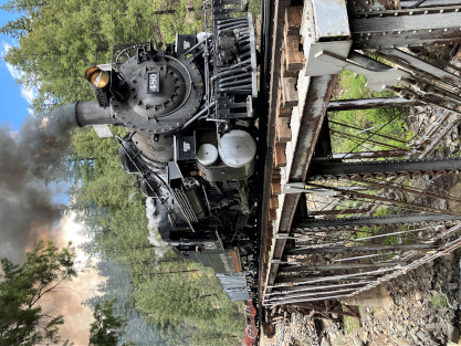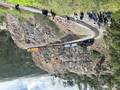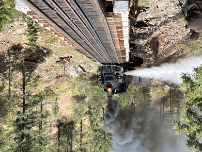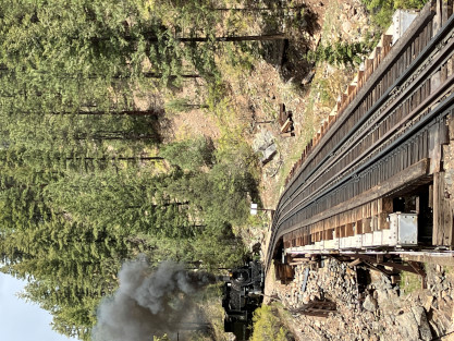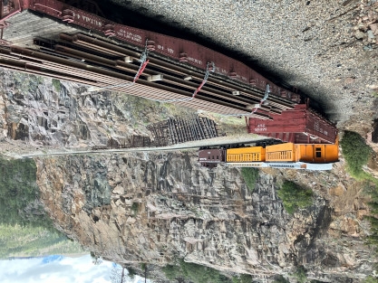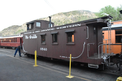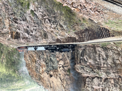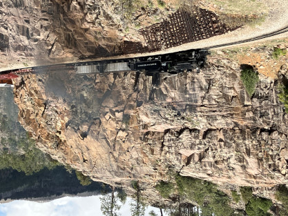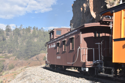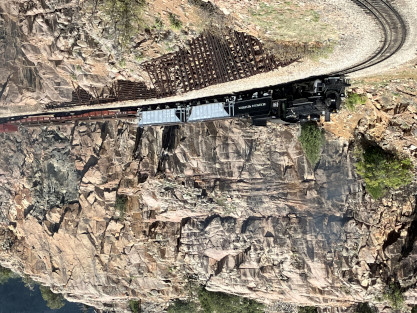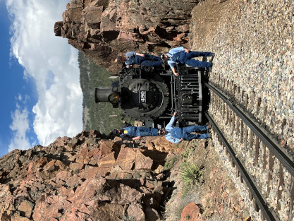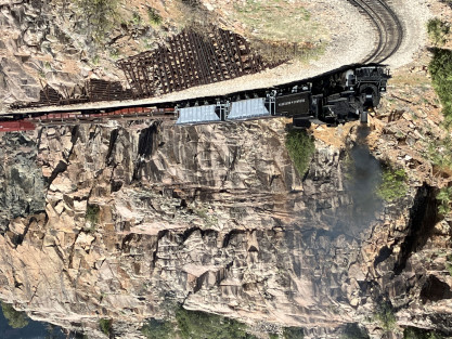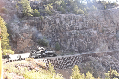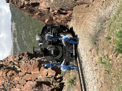 on the photo runby at No Name Creek, we could be back on schedule at the next southbound photo location, which we did. I think he made the correct decision. Almost everybody detrained for the photo line. The car in which Elizabeth and I were riding. Reverse move eleven. Photo runby eleven the Cement Wall, MP 476.50. Reverse move twelve. Photo runby twelve. We then proceeded south to the High Bridge, crossing on the Rio de Animss River at MP 471.23. Our caboose was always on the rear of our train. The trestle. Reverse move thirteen. The trestle once again. Photo runby thirteen at the High Bridge. The train then did reverse move fourteen. That trestle again. Photo runby fourteen. From here we went to the High Line, MP 469.30. Reverse move fifteen. Photo runby fifteen. Reverse move sixteen with some of the charter participants. Photo runby sixteen complete with blowdown. We walked to the cut that enters the High Line. The Animas River is far below. Photo runby seventeen. Crew member pictures; Russell Herdt, the Durango and Silverton's conductor and fellow in charge of charters, is on the left on the ground. Reverse move seventeen. Photo runby eighteen at the Rockwood Cut, MP 469.15. Photo runby nineteen. That was the last runby of the event and completes my coverage of the Dak Dillion Photo Charter on the Durango and Silverton. It was everything I had hoped for and more. Thank you first to Dak and secondly to