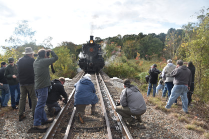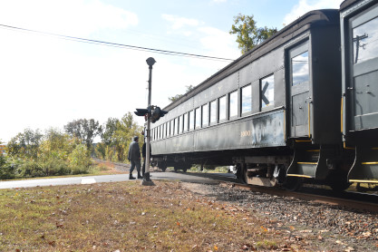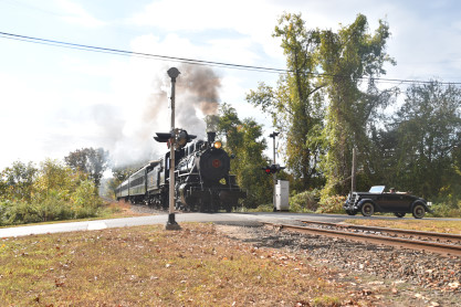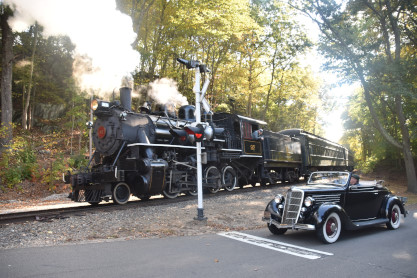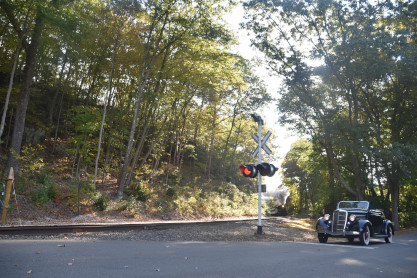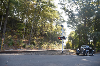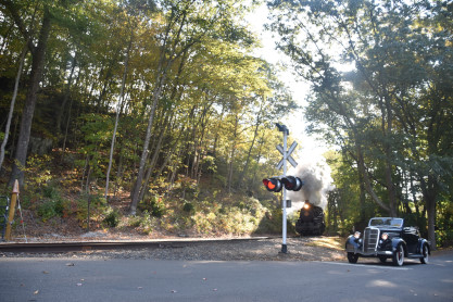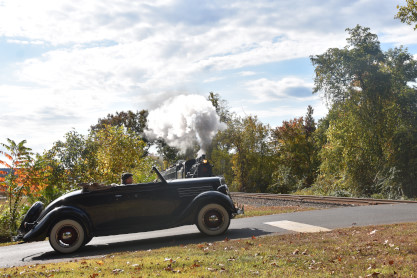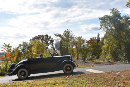 The engine reversed onto the point of our train, everyone boarded and soon we were off to our first set of photo runbys at Deep River Road, Milepost 4.5, featuring a 1930's Ford Cabriolet.