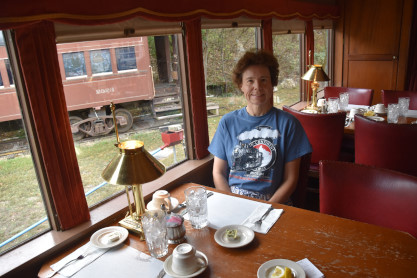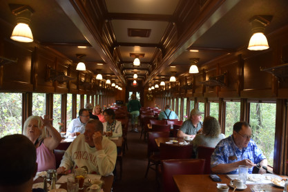 The author in dining car one. Caesar salad and rolls and butter were served first, followed by the main course which all passengers pre-ordered. I chose the chicken strips and Elizabeth had the beef stroganoff, both of which came with green beans. Our meals were excellent.
