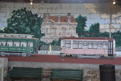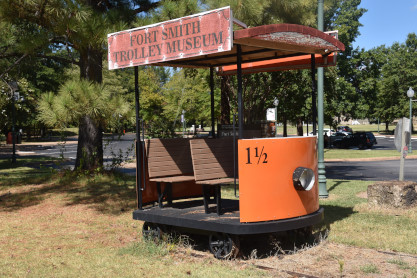 There is a very nice trolley mural on the wall which local artist John Bell, Jr. designed in 1990, and directed a team of his art students in painting it. The mural depicts the 50-year heyday of street railway transportation in Fort Smith, beginning with the mule-drawn streetcars of 1883, on the far left. The second car shown is an open car, in which the motorman stood outside. After that came the semi-convertible trolley and, on the far right, the Birney "safety car," which was used until Fort Smith Light & Traction Co. closed in 1933. Four historical buildings are shown in the background, including Fort Smith's W.H.H. Clayton house and the Fort Smith Art Center.