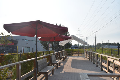 The patio where the Cloverdale Summer Music Festival performances take place. To accommodate increasing numbers of visitors, a platform expansion became necessary. In 2020, the Fraser Valley Heritage Railway Society was successful in being awarded a heritage infrastructure grant from the provincial government that has made possible the construction of various new projects at the Cloverdale campus, including completion of the Cloverdale Station platform/patio to accommodate a two-car consist.