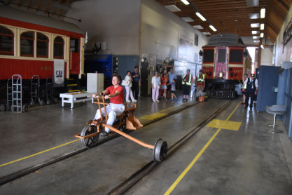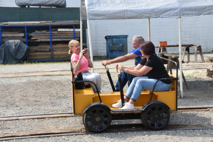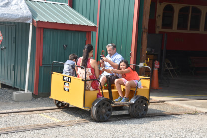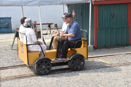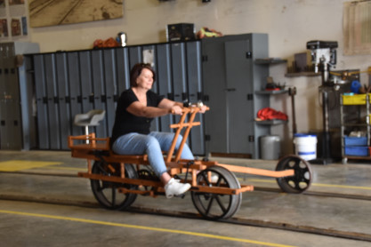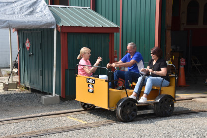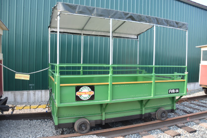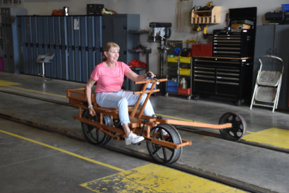 The quad car, FVR-5, built by Terry Nichols and other members of the restoration crew, is part of the Heritage Rail Adventure. This originated from the discovery of a scrapped speeder base and the question arose of what to do with it. The shop crew knew that the old-style pump cars were popular but were too dangerous for the public to use, so they came up with their own version.