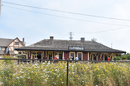 British Columbia Electric Railway Cloverdale replica station built in 2013. On July 1, 1910 when the British Columbia Electric Railway began passenger service through Cloverdale from New Westminster to Jardine on its new 64-mile electric interurban line to Chilliwack, Cloverdale quickly became the dominant community in the Fraser Valley, with residents enjoying a state-of-the-art travel experience to downtown Vancouver, via Cloverdale Station, in an hour- and-a-half.