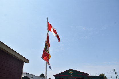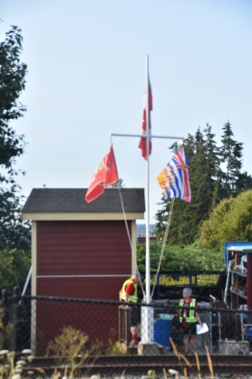 Stephen Plant and Barb Ducharme raising the flags of Canada, Fraser Valley Heritage Railway and the Province of British Columbia.