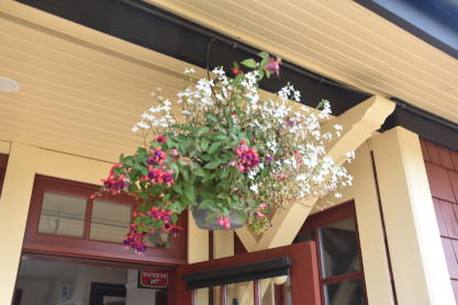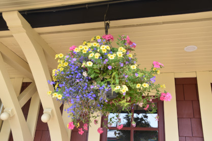 Two of the beautiful hanging baskets at the station, donated by Dave Baker of Bellingham, which are hooked up to the automatic watering system for the enjoyment of everyone throughout the season.