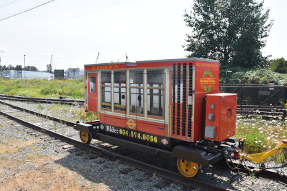 Fraser Valley Heritage Railway speeder carriage 11, originally a Pacific Great Eastern work trailer and donated by the West Coast Railway Museum. The volunteers replaced the rotten wood and spruced it up a bit, but the base is original.