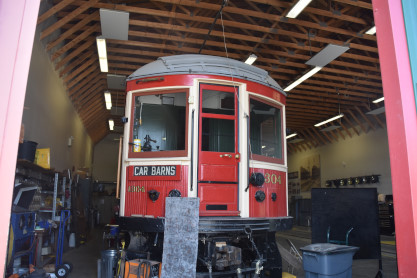 The Relaunch of Car 1304For several years, 1304 sat six feet in the air for ease of crew to work under the car. Finally, the area was cleared and the trucks (wheels and motor assemblies) were moved into place and lined up with the king pin to connect the car to the wheels. Hydraulic jacks were inserted at critical points, and activated with precision to allow for the removal of the wooden support piles until the steel I-beams could be removed and the car settled back onto its trucks, an operation of several hours.
