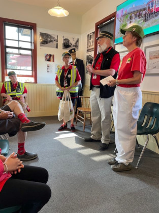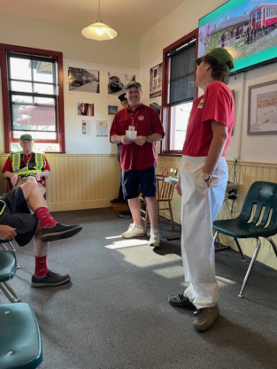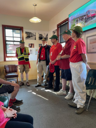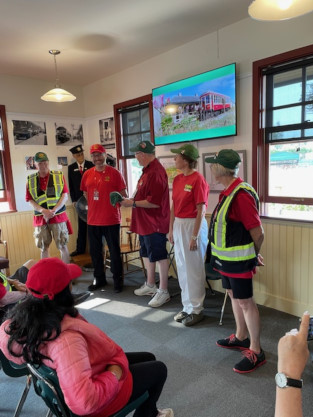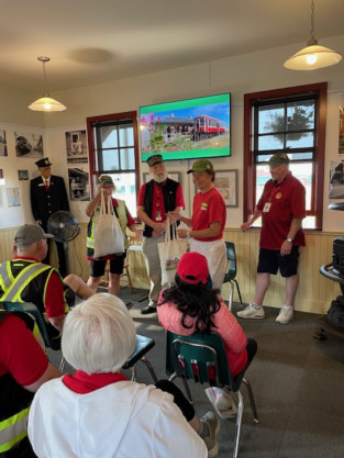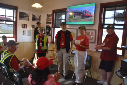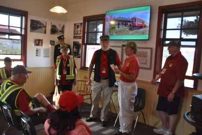 One of this season's new volunteers, Andrew Pickell, a former Southern Railway of BC engineer, had expressed interest in becoming a Station Master. He took to the position immediately and his presentation of a green Station Master hat and station keys was postponed two weeks until Elizabeth was present. Here, David and Chairman John Sprung present Andrew with his hat and keys and welcome him as the newest Station Master. Five of the seven Station Masters were in attendance this morning.