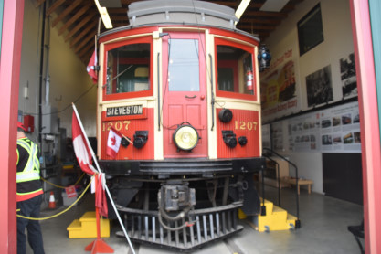 B.C. Electric interurban 1207 built by the railway in the New Westminster shops in 1905 to inaugurate service from Marpole to Steveston. Originally named the "Steveston", it was destined, along with three other cars, to close out the same line on February 28, 1958, bringing to an end all electric rail passenger service in British Columbia until the introduction of SkyTrain in 1986.
