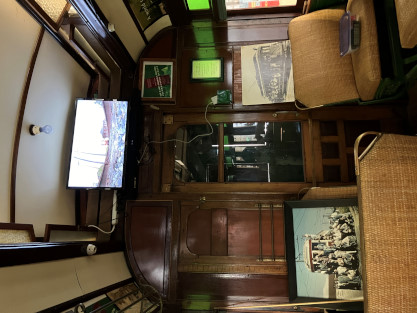 "Its interior, with seats and partitions removed, resembled a well-appointed living room, with carpet, curtains, and upholstered chairs, mostly in cream and green. The orange glass of the upper arches of the windows was masked by the curtains, and red light bulbs were strategically installed elsewhere to resemble an open fire in a grate."