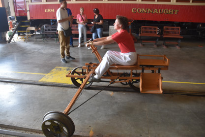 The author riding the velocipede, his first time. This is part of the Heritage Rail Adventure.
