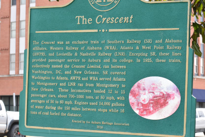 History board about The Crescent, an exclusive train of the Southern Railway and Alabama affiliates, Western Railway of Alabama, Atlanta and West Point Railway and Louisville and Nashville Railway.