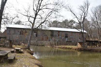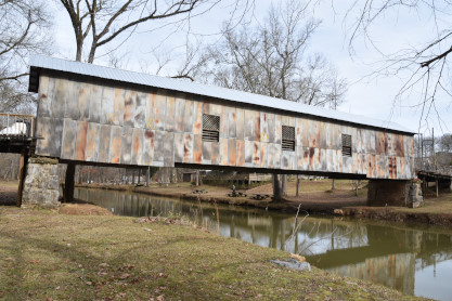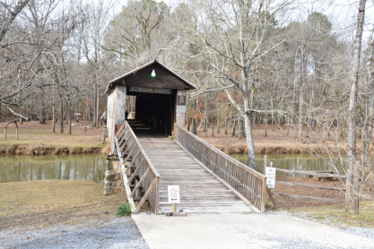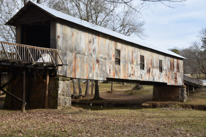 Kymulga covered bridge built in 1861, a wood and metal combination style bridge that spans Talladega Creek, located just east of Kymulga Mill within Kymulga Park. The 105-foot structure is a Howe truss construction over a single span, and is one of two 19th-century covered bridges extant in Alabama still remaining at its original location.