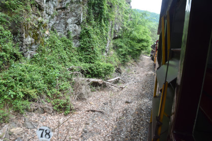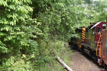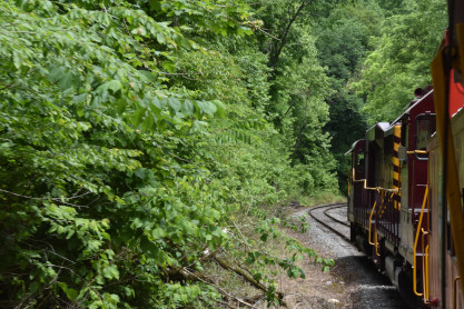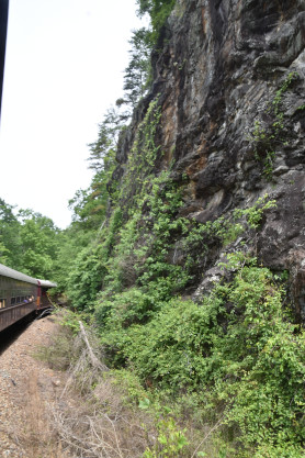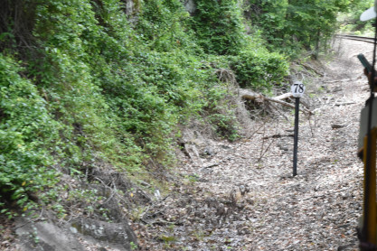We slowed to five miles per hour for the 17 degree curve, the tightest on this railroad, at Milepost 74.2 Talc Mountain.