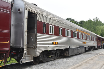 Great Smoky Mountains coach 3085 "Appalachian", ex. Cuyahoga Valley Scenic 110, ex. New Jersey Transit 3085, exxx. Erie-Lackawanna 3085, nee Santa Fe 52-seat coach 3085 built by Budd Company in 1937.