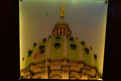 A picture of the Harrisburg Capitol in the elevator. At 11:20 AM, I went down the lobby and found Robin Bowers, who was having trouble with his phone and was with Greg and Marty.