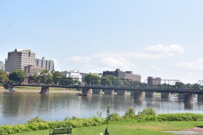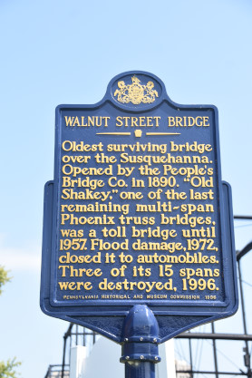 The Walnut Street Bridge, a truss bridge that spanned the Susquehanna River until 1996. Built by the Phoenix Bridge Company in 1890, it is the oldest remaining bridge connecting Harrisburg's downtown and Riverfront Park with City Island. Since flooding in 1996 collapsed sections of the western span, it no longer connects to the West Shore. The bridge was added to the National Register of Historic Places in 1971.