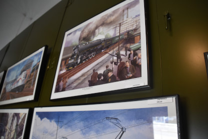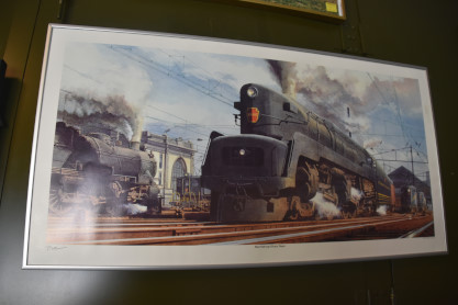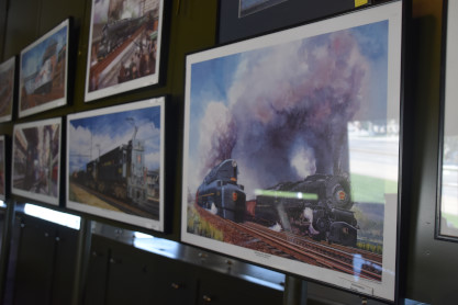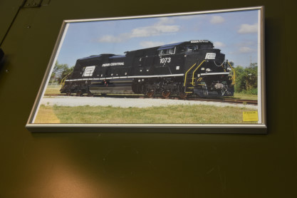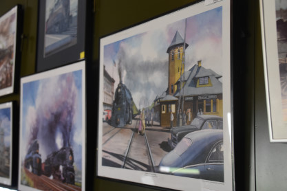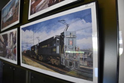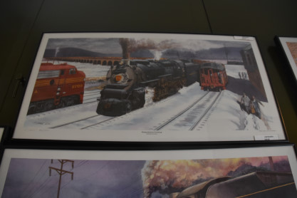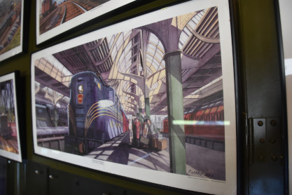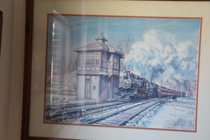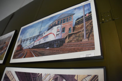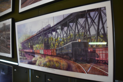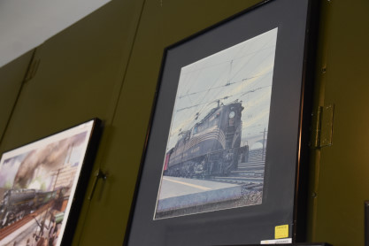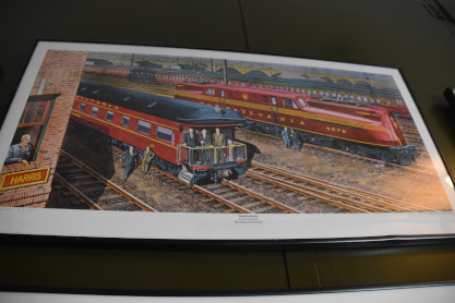 On one of the walls of Harris Tower is a series of paintings by Peter A. Lerro Jr., Illustrator and Graphic Designer. Growing up in the Philadelphia suburbs, Pete fell in love with the many trains, trolley cars, subways and buses at a very early age. Spending hours drawing and coloring was a daily occurrence and eventually became the passion that he wanted to pursue as a professional. Distribution of his work is worldwide. He has been commissioned by museums, historical societies and railroads for original art. His portfolio includes a vast collection of railroad watercolor paintings and reproductions available to everyone.