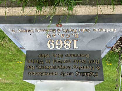 "Fighting early snowstorms and frezeing tempertures, the first train arrived in Vinton on December 14, 1869".