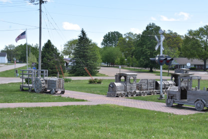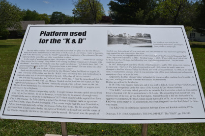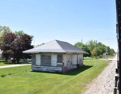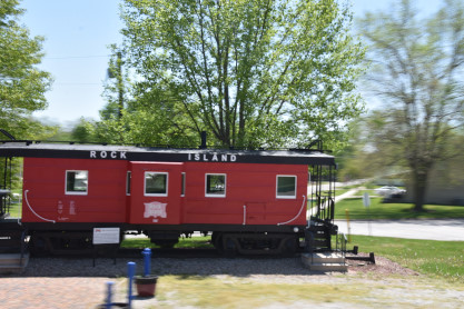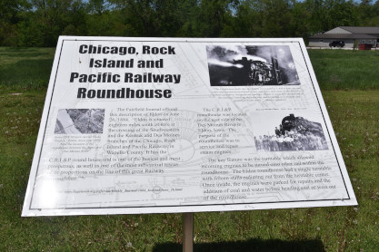 Chicago, Rock Island and Pacific 50 foot flatcar 91333 builder and year unknown. Alton caboose C3055 painted as Rock Island, built for the Alton on the late 1940's and its successor, Gulf Mobile and Ohio, rebuilt it as a wide vision in the 1970's. The display train from the rear. Platform used for the Keokuk and Des Moines Railroad display board. Chicago, Rock Island and Pacific Railway Roundhouse display board. The mural on the side of the Eldon Model Railroad building. This building houses the Eldon Depot Model Railroad. A railroad play yard. Mainliner Park for childern. Our final stop was in Kirksville, Missouri. Chicago, Burlington and Quincy Kirksville station built in 1905. We stopped at Colton's Steakhouse for dinner then Elizabeth drove us back to Columbia. It had been a great trip to Iowa and a unique NRHS spring conference in Cedar